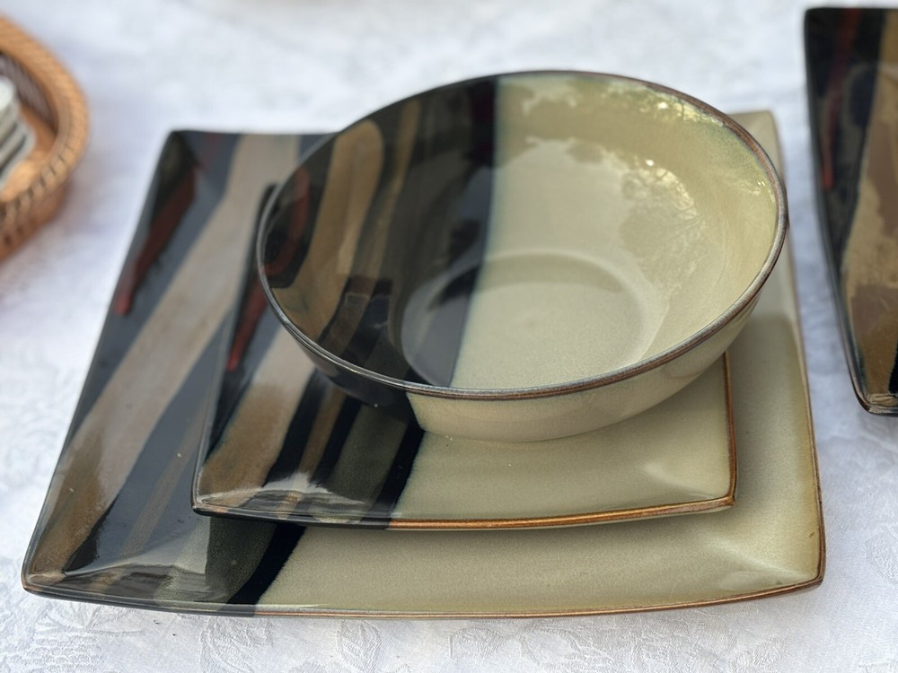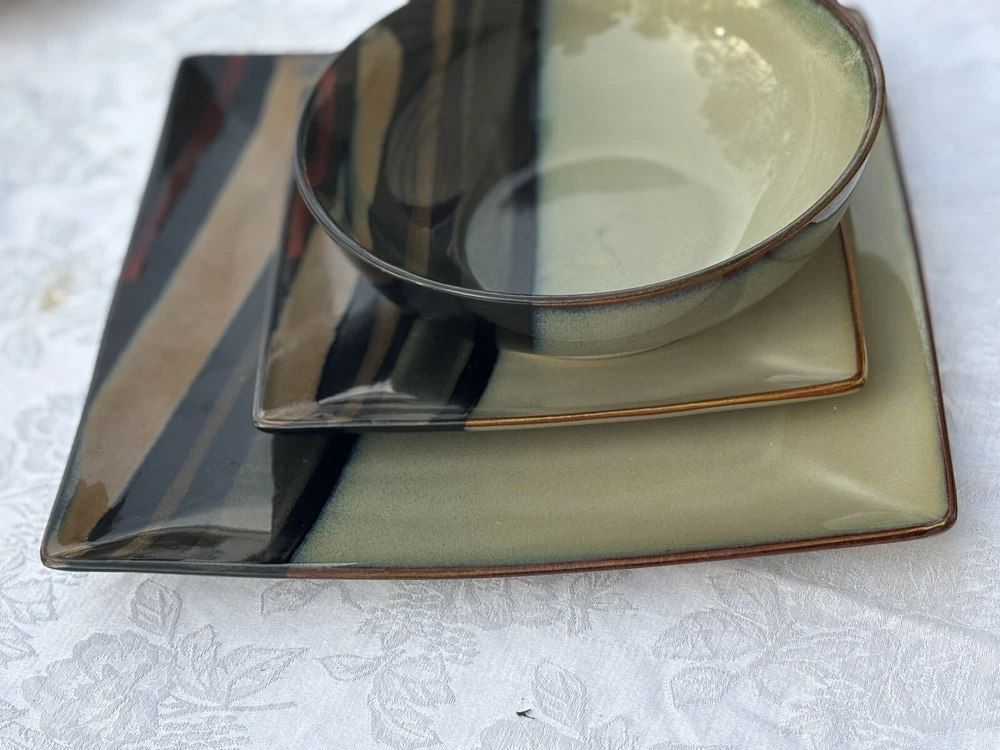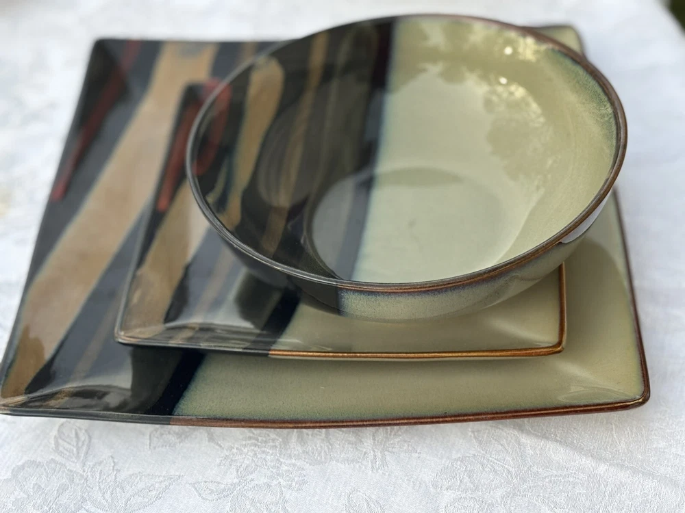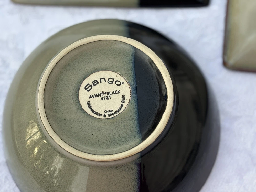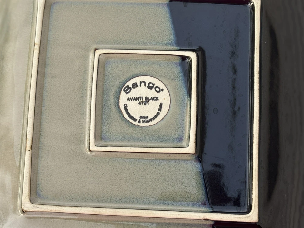 Handmade: No Brand: Sango Item Weight: 5lbs Original/Licensed Reproduction: Licensed Reproduction Type: Plate Vintage: Yes Style: Contemporary Color: Multicolor Occasion: All Occasions Features: Dishwasher Safe, Decorative, Stackable Era: 21st Century (2000-now) Item Length: 12” Finish: Glossy Care Instructions: Machine Washable up to 100°F Production Style: Blue and White Pottery Shape: Square Item Height: 15 in Item Width: 12” MPN: NA Antique: No Product Line: Fiesta Theme: Abstract Plate Diameter: 12” X12” Manufacturer Warranty: NA Pattern: Avanti Black Origin: Unknown Backstamp: Printed Set Includes: Salad Bowl, Dinner Plate, Salad Plate Year Manufactured: 2009 Number of Items in Set: Six-Piece Country/Region of Manufacture: China Material: Stoneware Time Period Manufactured: 2010-2019 Department: Adult, Teens Production Technique: Pottery