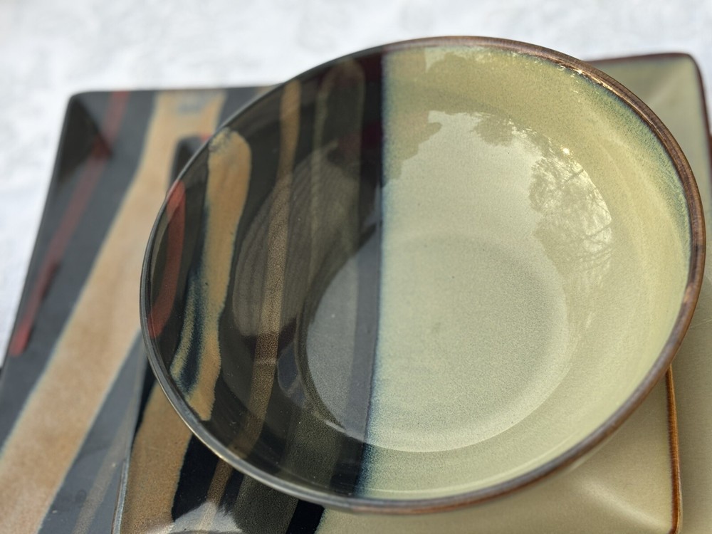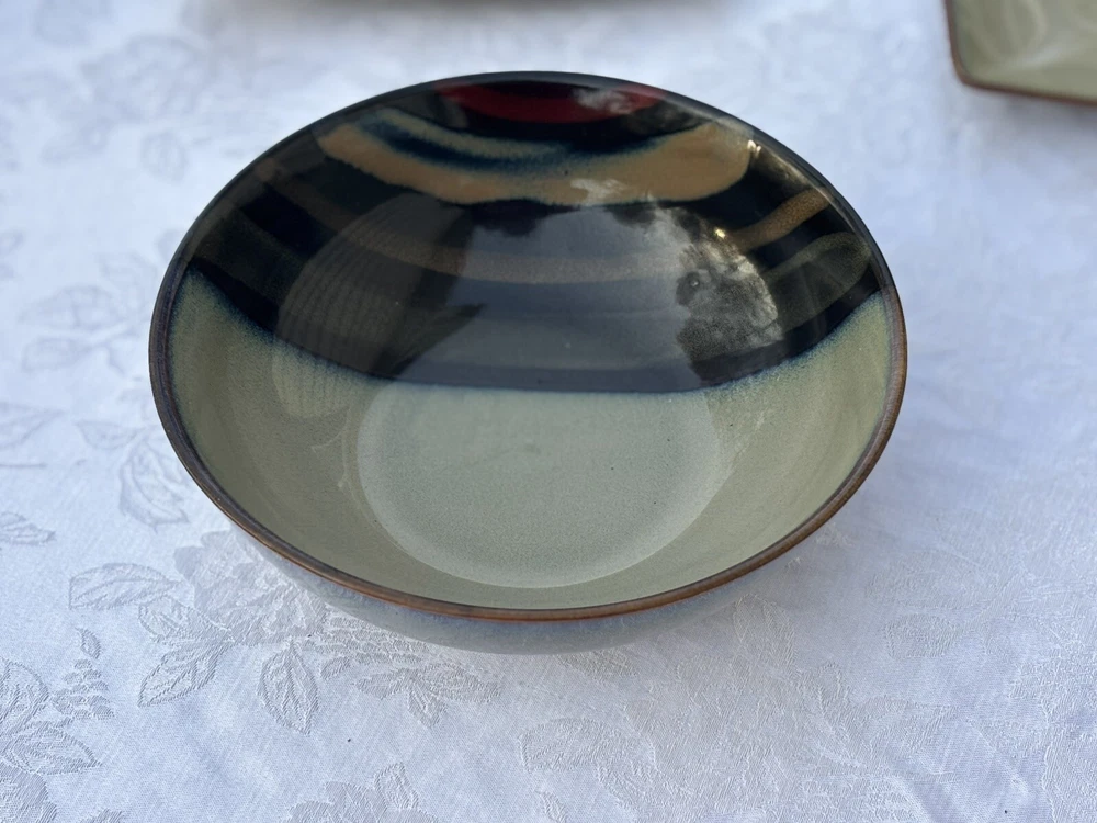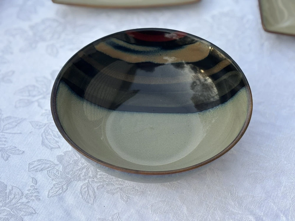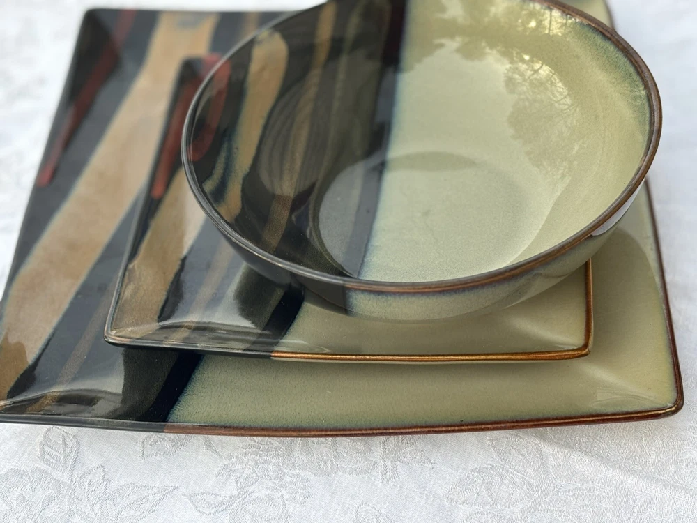 This six-piece Sango Avanti Black pottery set is perfect for all occasions. The set includes a 12" x 12" dinner plate, a 7" salad bowl, a 9" salad plate, and a 15" dish. The plates are machine washable up to 100°F, making them easy to clean. They are also stackable, dishwasher safe, and decorative. The contemporary style plates feature a glossy finish and an abstract theme. They are licensed reproductions produced in China using a pottery production technique. The set weighs 6.6 lbs and has a printed backstamp. Sold as a lot, 2 place settings dinner plate, salad plate, soup bowl. Enjoy your meals on these stylish and functional plates. Returns accepted within 30 days; buyer pays return shipping . Note: local pickup save shipping cost.