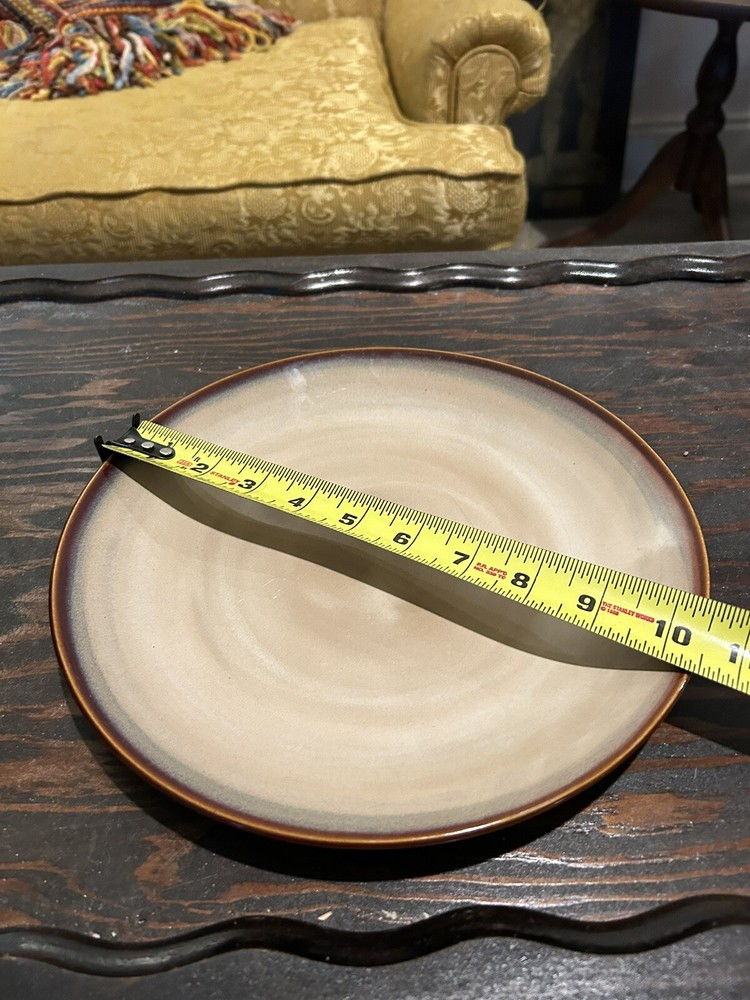 Sango Nova Brown 4933 10-1/2" Dinner Plate is a contemporary stoneware plate from America, manufactured in 2004. It features a glossy finish, round shape, and a Nova Brown pattern. This licensed reproduction plate is microwave and dishwasher safe, part of the Earth product line by Sango. The set includes one dinner plate, suitable for all occasions. Made in China, it is stackable and measures 10-1/2" in diameter. Qty 1