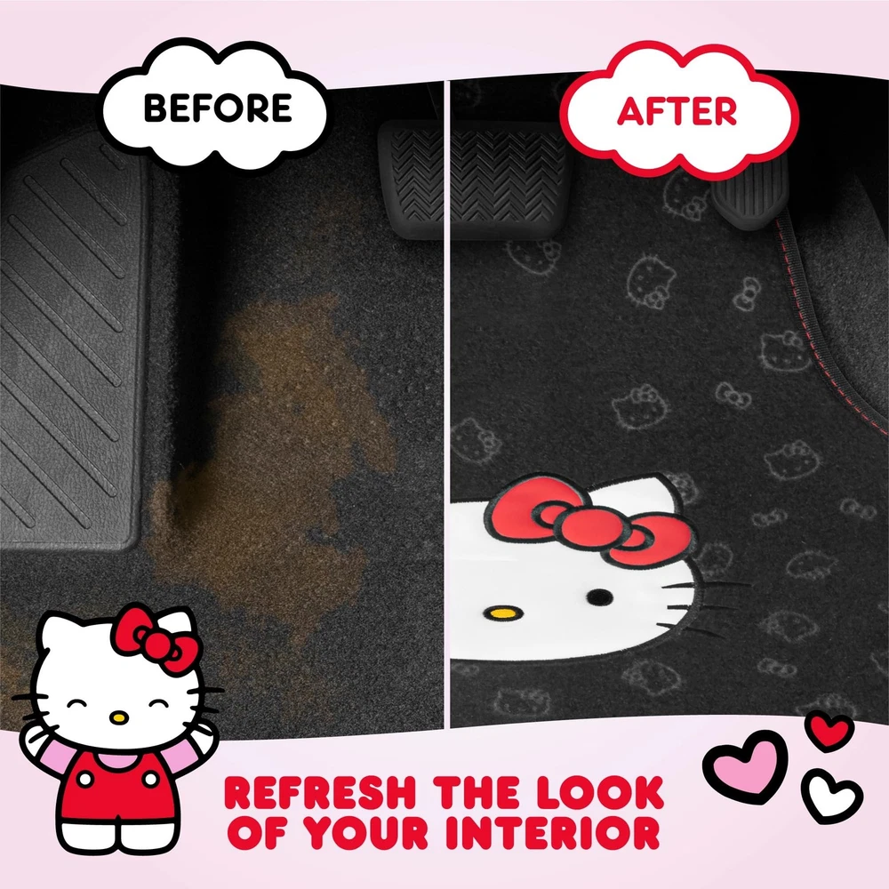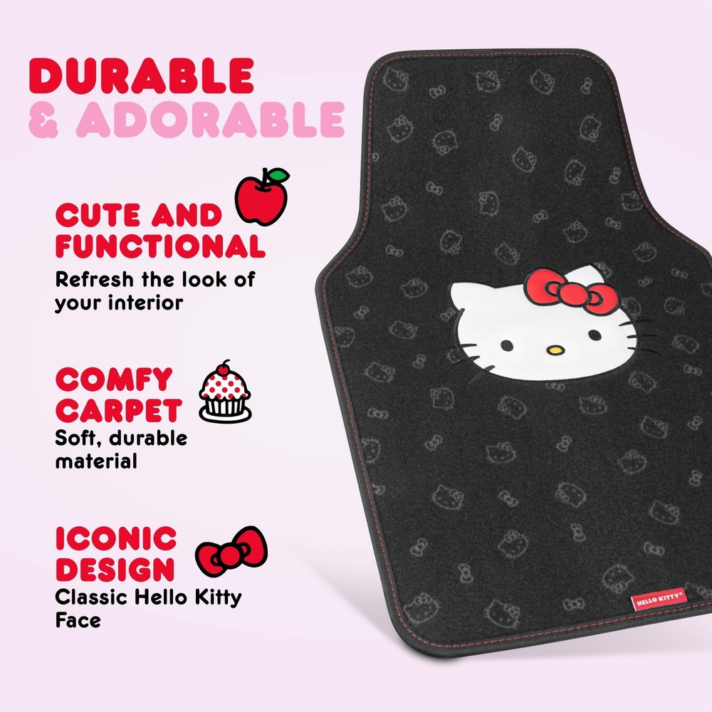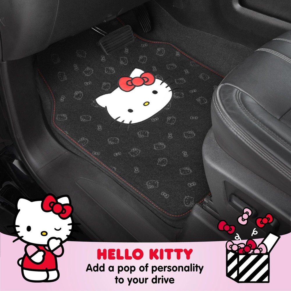 Sanrio Hello Kitty Carpet Car Floor Mats, Universal Fit for Cars Trucks SUVs Hello Kitty Car Accessories for Women Cute Car Accessories, Non-Slip Front Rear Floor Mats for Cars Product Details Color: Carpet Hello Kitty Midnight Brand: Carbella MPN: SRMT-1101 UPC: 826942165337 EAN: 0826942165337 Material: Polyvinyl Chloride (PVC) Color: Carpet Hello Kitty Midnight Brand: Carbella Product Dimensions: 25.25"L x 16.25"W x 1"Th Vehicle Service Type: Passenger Car, SUV, Truck, Van Auto Part Position: Front Inner, Rear Inner Fit Type: Universal Fit UPC Manufacturer: BDK Automotive Fit Type: Universal Fit Manufacturer: BDK Brand: Carbella Model: SRMT-1101 Item Weight: 3.32 pounds Product Dimensions: 13 x 5 x 16 inches Item model number: SRMT-1101 Manufacturer Part Number: SRMT-1101 Date First Available: October 8, 2024 AUTHENTIC SANRIO DESIGN Officially licensed by Sanrio, this Hello Kitty floor mat set is part of the Hello Kitty and Friends collection by Carbella x Sanrio. Each piece features charming artwork inspired by your favorite characters, blending playful style with quality craftsmanship. UNIVERSAL FIT FOR MOST VEHICLES Designed to suit a wide range of cars, trucks, SUVs, and vans. The set includes front mats measuring 25.25" x 16.25" and rear mats measuring 12.5" x 16.25", providing balanced coverage for both driver and passenger areas. With an easy-to-install design, these mats slip right into place and remove just as effortlessly, making them a versatile upgrade for nearly any vehicle interior. ANTI-SLIP BACKING FOR SAFETY Built with non-slip rubberized backing, these mats stay securely in place while driving. No sliding, bunching, or movementjust stable, reliable protection for your car floors, keeping safety and comfort in mind. EASY TO CLEAN AND MAINTAIN Keep your mats looking fresh and stylish with minimal effort. Shake them out to remove debris, vacuum for deeper cleaning, or quickly spot clean stains to maintain their vibrant look and long-lasting durability. DURABLE PROTECTION & COMFORT Made with premium carpet material that not only defends your vehicles floors from dirt, spills, and everyday messes but also adds a touch of comfort underfoot. Built to withstand daily use while keeping your car interior fun and fashionable. Sanrio Hello Kitty & Friends Carpet Floor Mats Carbella x Sanrio brings together the world of cute and practical with the Hello Kitty and Friends Kuromi Carpet Car Floor Mats. Designed for Sanrio fans who want to show off their love for Kuromi and her friends while protecting their car’s interior, these mats are the perfect blend of personality and function. The officially licensed Sanrio artwork adds a playful charm that makes every drive more enjoyable, while the high-quality carpet construction provides reliable durability against dirt, spills, and daily wear. Each mat features a universal fit suitable for most cars, trucks, SUVs, and vans, making it a versatile choice whether you’re commuting, road-tripping, or just cruising around town. The non-slip backing keeps the mats securely in place, ensuring safety without constant adjustments. Plus, maintenance is simple—just shake them out, vacuum, or spot clean to keep them looking fresh. With their mix of style, comfort, and protection, these Kuromi floor mats are more than just car accessories—they’re a fun way to bring a touch of Sanrio magic into your daily drives. Perfect for Sanrio collectors, Hello Kitty lovers, or anyone who wants to make their vehicle interior a little more cute and colorful, these mats also make a thoughtful gift for fans of all ages.