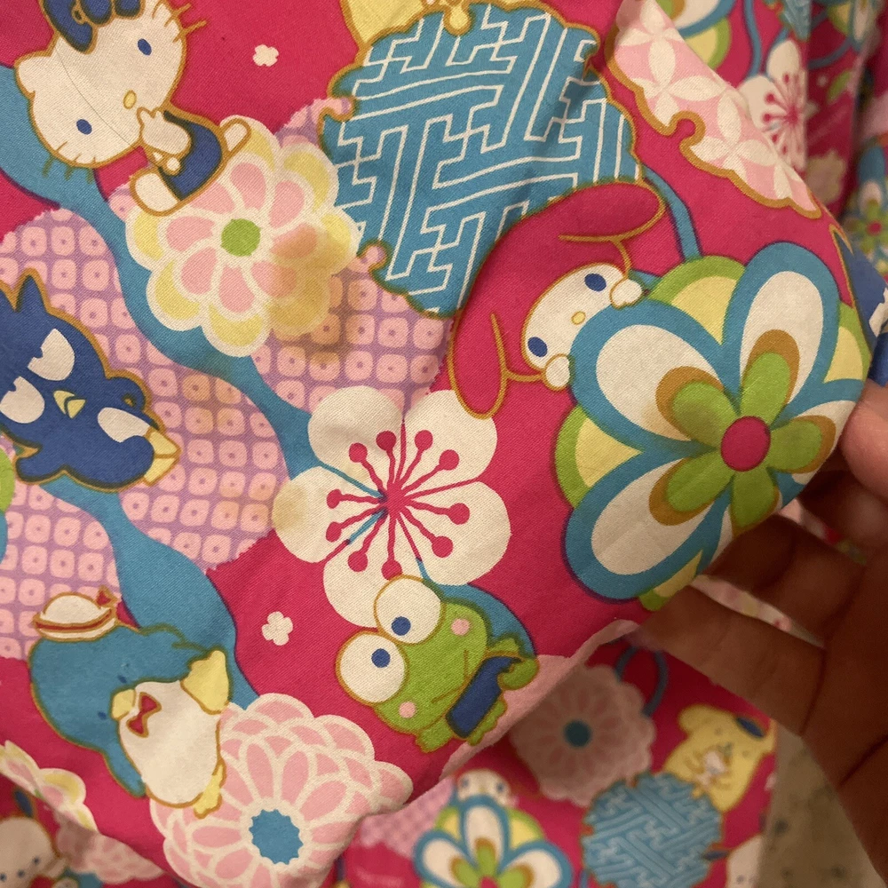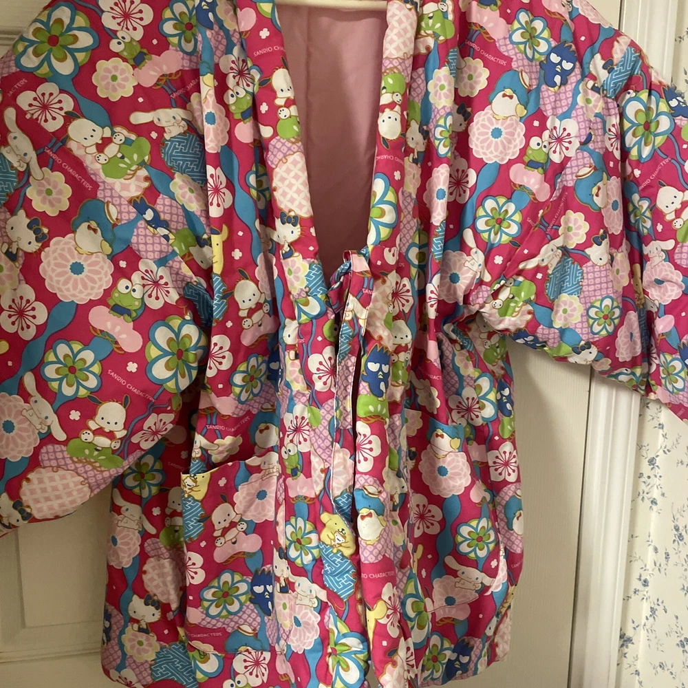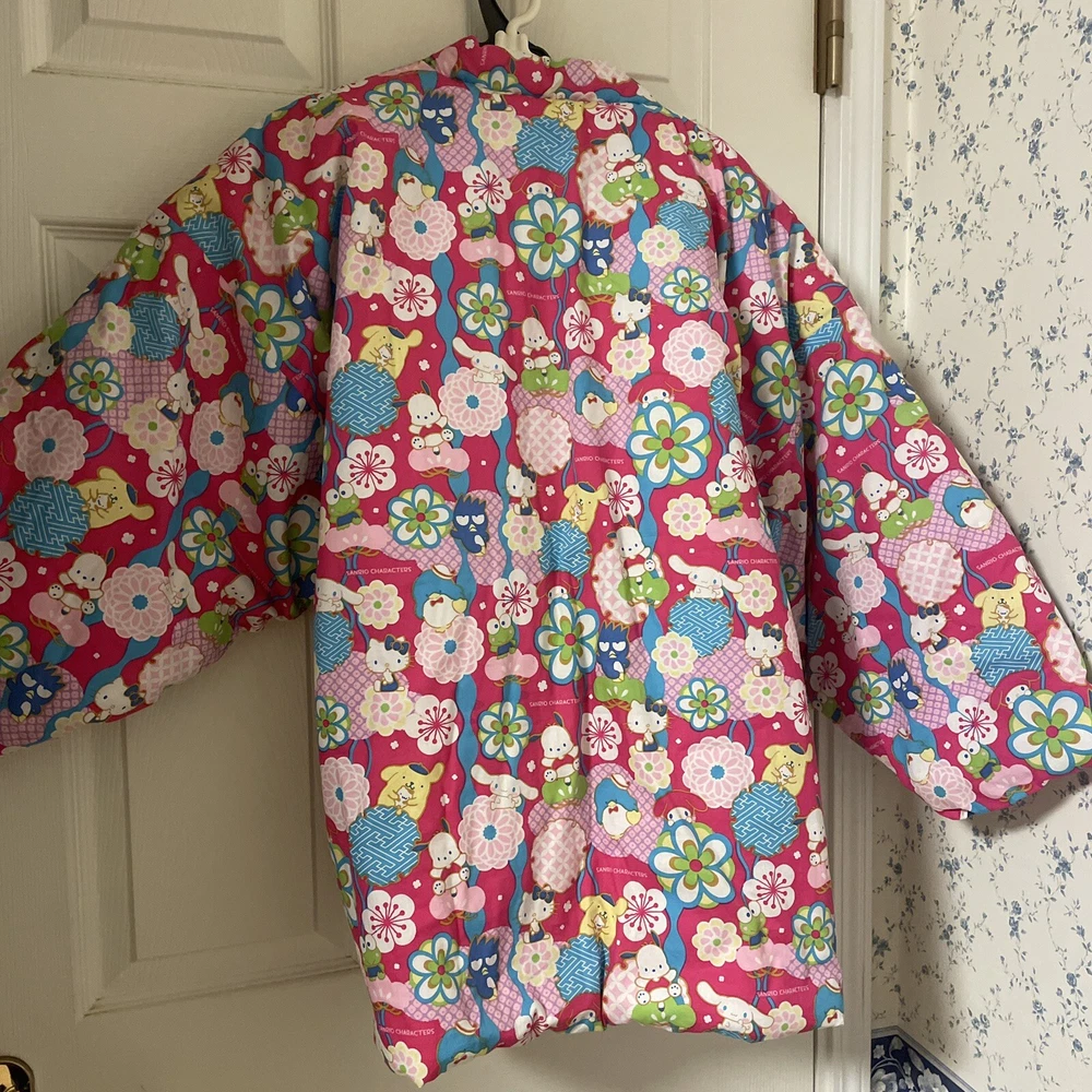 Sanrio Japanese Hanten Kimono Jacket - Limited Edition This is a rare, limited-edition Sanrio Hanten , a traditional Japanese kimono jacket. Originally available only as a lottery prize, this unique item was not sold in stores and is highly collectible. Product Details Product Name: Sanrio Hanten Manufacturer: Sanrio Series: Sanrio Prize Lottery Year: Unknown (from Japanese lottery event) Released in: Japan Size (approximately): Bust: 31-37 in. (79-94 cm) Height: 60-64 in. (154-162 cm) Condition I haven't used it, but there are some stains from storage. Why Buy This? Hanten jackets are versatile and functional, traditionally used in Japan during colder seasons or as a stylish overcoat for kimono. With its rare Sanrio design and limited availability, this piece is a must-have for collectors and fans of Japanese culture!