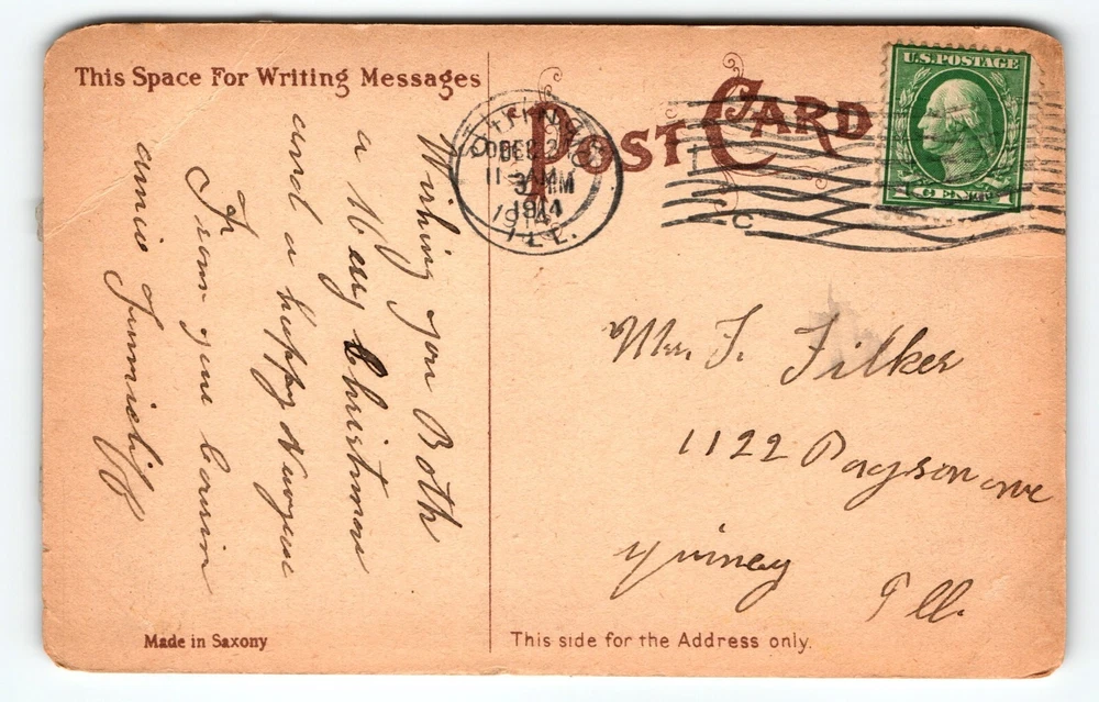 Posted with 1914 cancel. Antique original vintage post card. Has damage with clear tape applied, cracks to gel coat, creases, rounded corners, and age wear. Stock #santa603. Additional postcards are in our store. All post cards are old originals and may or may not have writing on back.