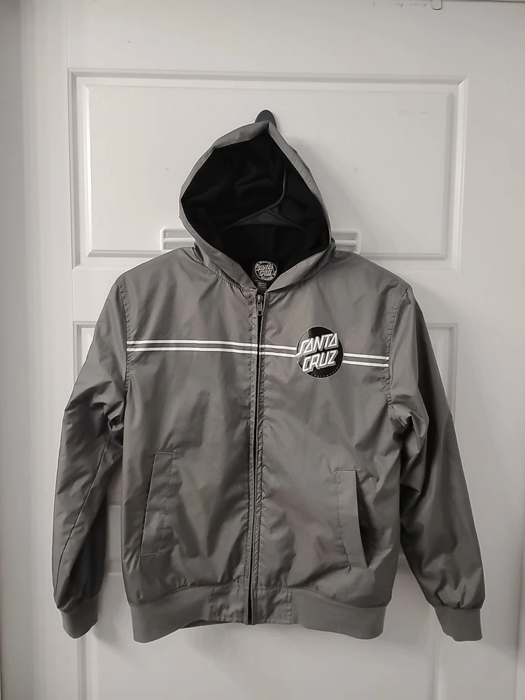 Crafted for the young skater on the go, the Santa Cruz Youth Medium Hooded Windbreaker Jacket in Charcoal Gray is a versatile addition to any active wardrobe. The jacket features a full zip closure, long sleeves, and an elastic waist for a comfortable, secure fit. Its lightweight 100% polyester construction is lined for extra warmth, making it suitable for all seasons, from the breezy spring afternoons to the crisp fall days. The jacket is designed with functionality in mind, boasting a hood for protection against the elements and pockets for convenience. The classic gray color accented with the iconic Santa Cruz logo offers a timeless skater vibe. Whether it's for skateboarding or just casual wear, this jacket is built to keep up with energetic activities while keeping your youth looking stylish. The larger logo on the back shows some minimal visual signs of wear and the logo on the front is in good shape.