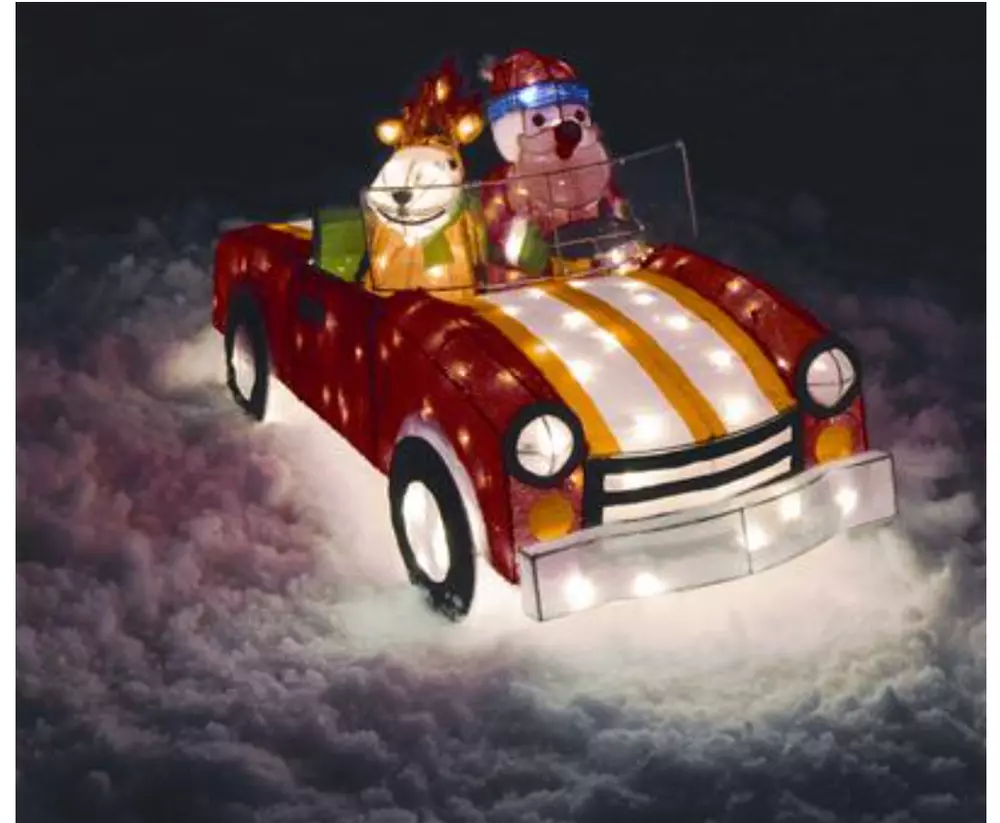 Santa in Race Car Outdoor Christmas Decoration Deck the lawn in festive cheer with Santa delivering gifts in his reindeer-less sleigh. Santa in car lawn decoration features 200 clear bulbs and an easy-to-assemble design with a sturdy metal frame. Fast and Free Shipping!