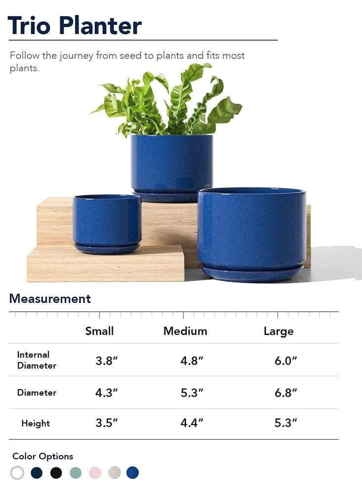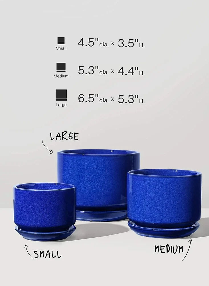 BEMAY Ceramic Plant Pots are versatile and can be used indoors or out. They have drainage holes and saucers to prevent overwatering. These flower pots come in three sizes: small (4.3"D X 3.5"H), medium (5.3"D X 4.4"H), and large (6.8"D X 5.3"H). They are suitable for a variety of plants, from spider plants to succulents. These indoor plant pots are sleek and stylish, making any space look better. They work well with different types of plants and leaves. These indoor planters are simple, modern, and stable. They will look great in your indoor oasis or outdoor retreat. 4.3+5.3+6.8 inch Plant Pots High Quality Ceramic Material Planter with Drainage Hole and Saucer Use as Indoor Planters and Outdoor Planters Features: Perfect Sizes for Various Plants: Each planter is meticulously crafted in different sizes to accommodate a variety of smaller plants such as spider plants, nerve plants, succulents, or even artificial plants. Small pot (4.3 inches D x 3.5 inches H), Medium pot (5.3 inches D x 4.4 inches H), and Large pot (6.8 inches D x 5.3 inches H) - there's a perfect fit for every green companion. Efficient drainage system: These garden pots with drainage hole & drip pans & drainage net. The drainage plates are attached to the bottom of the pots and do not come off. Drainage Net is included and is designed to prevent plant soil from falling off. Durable Stoneware Construction: Crafted from high-quality fired stoneware, these outdoor planters are durable and reliable, able to withstand extreme temperatures. They have a sleek and sturdy design, and come in premium ceramic material. The packaging makes them an excellent choice for gift-giving. Elegant Modern Design: This ceramic planter has an elegant and modern design with different color options. It comes with a matching tray and a curved silhouette, making it a stylish and timeless accent piece for both indoor and outdoor spaces. Ready to Use: With no assembly required, these indoor plant pots are hassle-free to use. Simply place them in your desired spot, fill them with soil, and nestle in your favorite plants to instantly elevate your indoor or outdoor decor with a modern touch. Specification: Brand: BEMAY Product: Ceramic Plant Pots Color: Sapphire Blue Product Number: 3 Product Shape: Round Large Planter Size: 6.8"x 5.3" (D*H) Medium Planter Size: 5.3"x4.4"(D*H) Small Planter Size: 4.3"x3.5"(D*H) Product Weight: 5.8 lb Product Material: Ceramic Special Feature: Drainage Hole, Saucer, Weather Resistant, Decorative Planters Package List: 6.8" Plant Pots*1 5.3" Plant Pots*1 4.3" Plant Pots*1 Mesh Circle*1 pcs