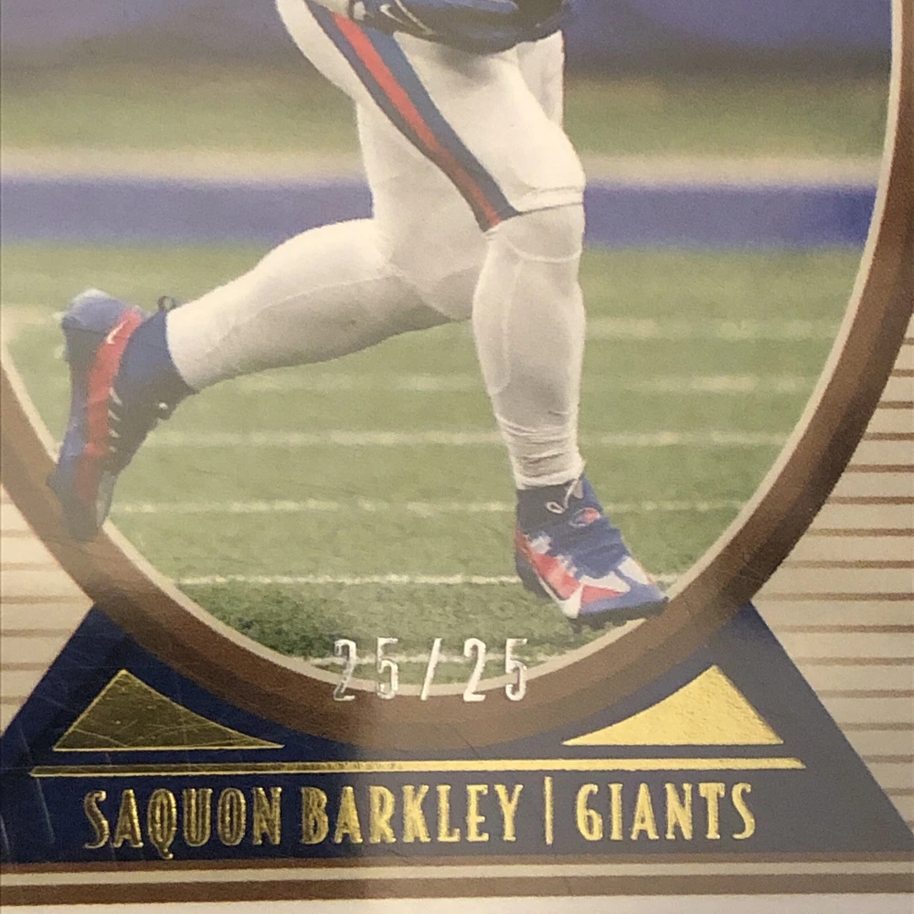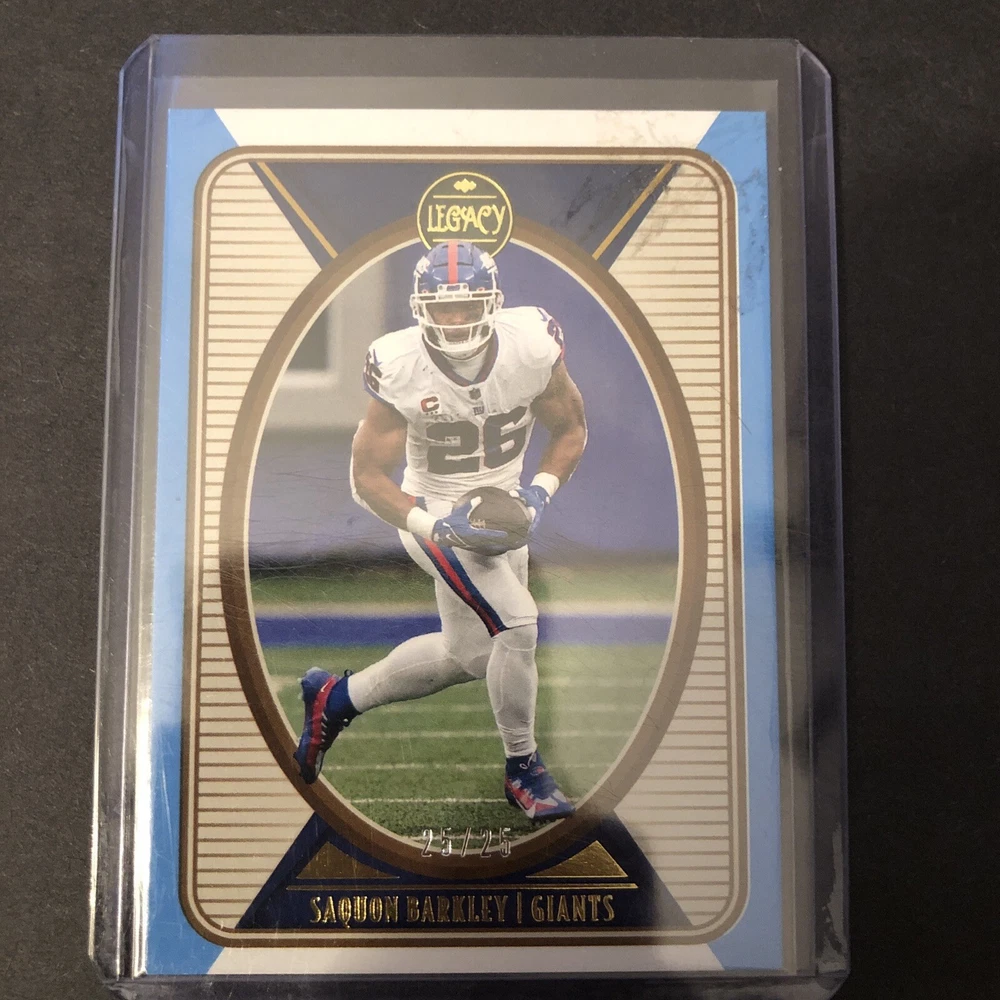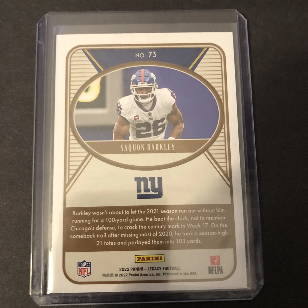 This rare Saquon Barkley Legacy sports trading card is a must-have for any football fan's collection. With a beautiful blue parallel/variety and serial numbering features, this card is a true gem. The card number is 73 and it is from the 2022 season. The card is in excellent shape, near mint or better, and has not been graded. It is a single trading card and is perfect for sports trading card enthusiasts. Don't miss your chance to own this unique piece of sports memorabilia.