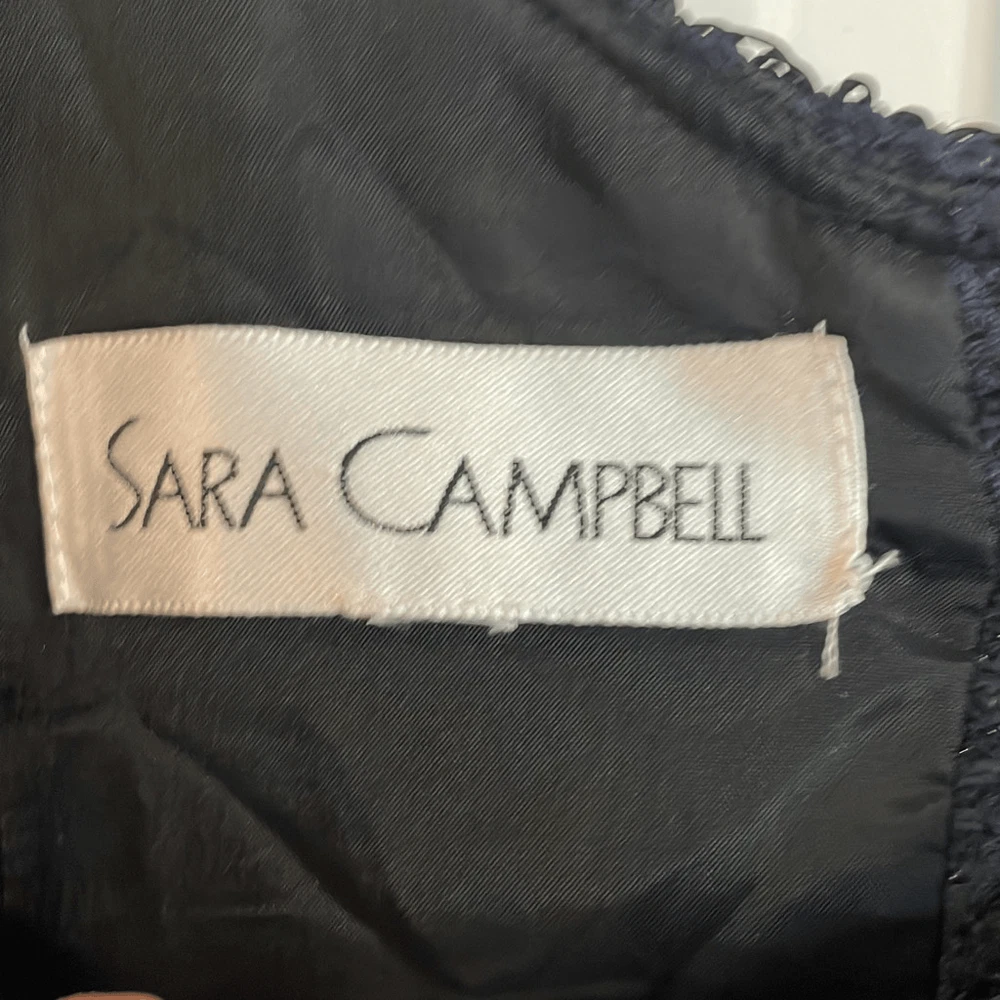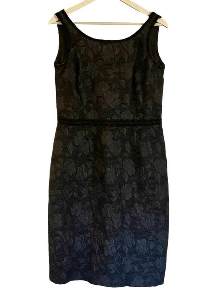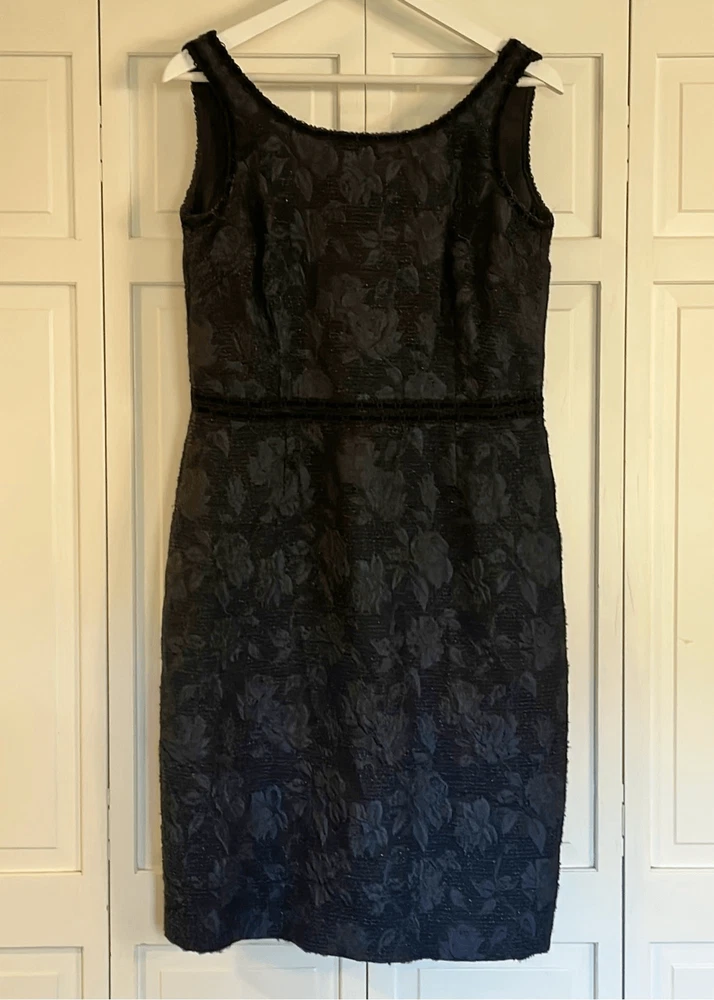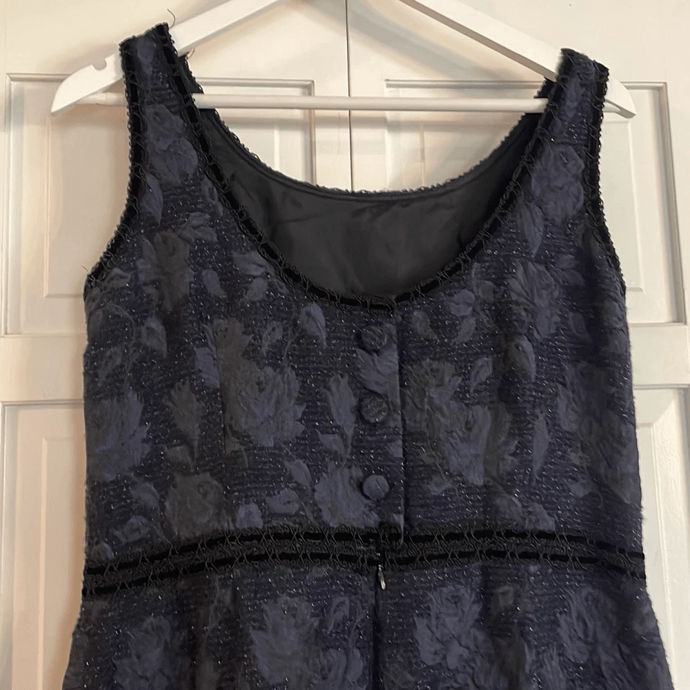 Brand: Sara Campbell Description: wool blend brocade sleeveless dress with silk lining- allover rose print with ribbon trim Size: missing size tag but measures like an 8 Color: navy and black Condition: Gently Worn Very Good ๐๐ป Measurements: Pit to pit: 18โ Length: 40โ **Bundle and Save!!** all measurements are approximate and taken laying down A12