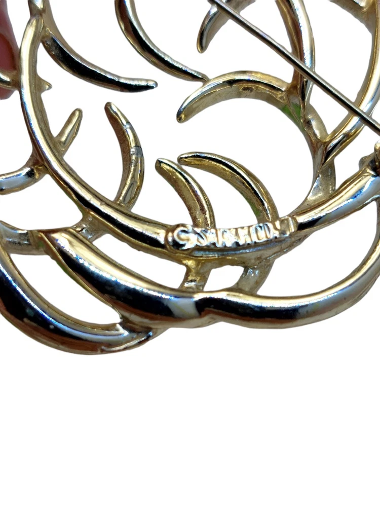 Type:BroochShape:RoundJewelry Department:FashionColor:GoldMaterial:Gold Tone MetalBase Metal:GoldCountry/Region of Manufacture:United StatesBrand:Sarah CoventryApproximate Measurements:2 Inches x 2.25 InchesSigned:YesFastener:Safety C ClaspMetal:Gold Tone MetalModified Item:No