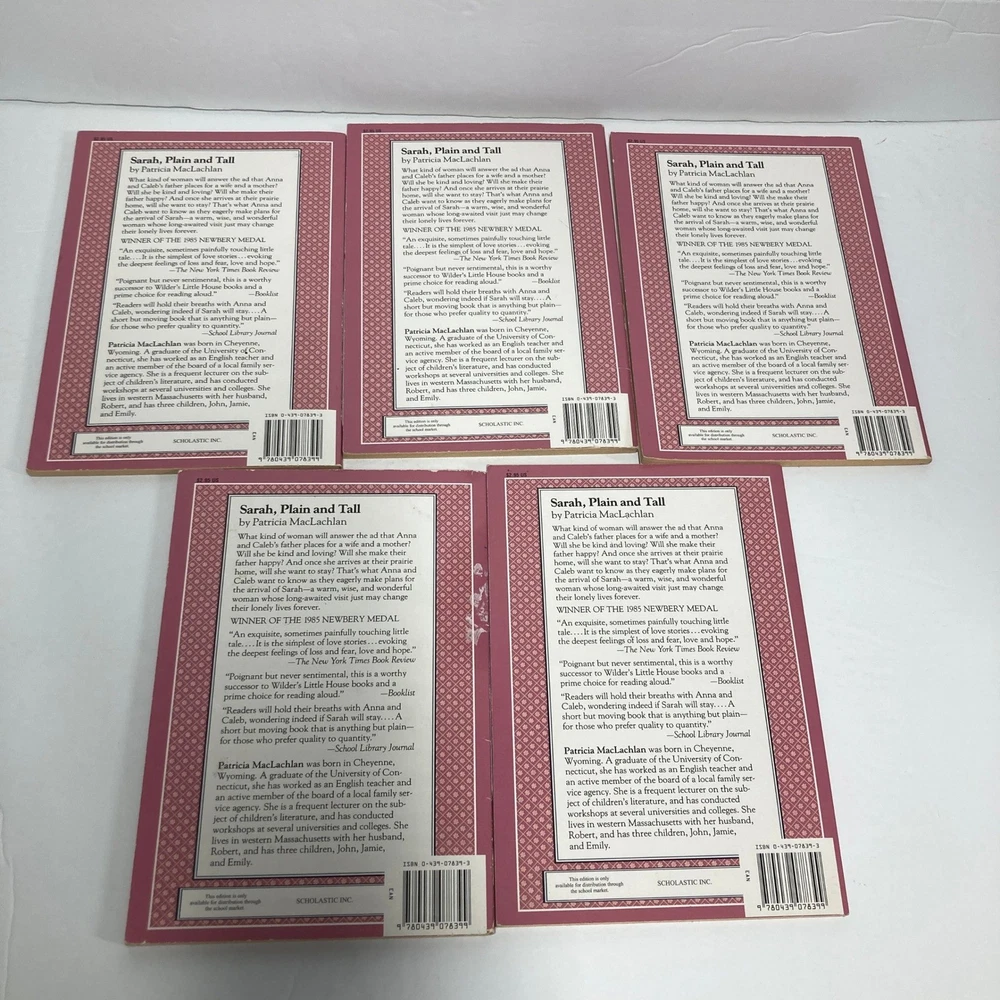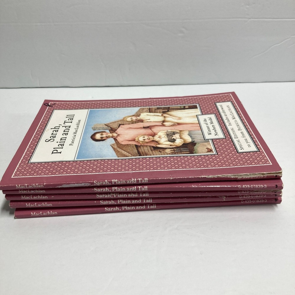 A special edition set of the beloved children's book Sarah Plain and Tall by Patricia MacLachlan. This collection features multiple copies of the award-winning novel, including an afterword from the author. Perfect for classroom sets, book clubs, or young readers eager to explore classic American literature, these books are ideal for sharing stories and sparking imagination during quiet reading time or family story sessions. Author: Patricia MacLachlan Book Title: Sarah, Plain and Tall Language: English Topic: Children Publisher: Scholastic Inc. Format: Paperback Genre: Children & Young Adults, Historical, Bedtime Stories & Nursery Rhymes Original Language: English Features: Illustrated Type: Novel Edition: Special Edition Keywords: Newbery Medal winner, historical fiction, school reading, early reader, childrens literature, paperback books, classic stories, author's afterword, Scholastic, family reading, educational, learning Good condition. These were used in a classroom and show some signs of wear. Stickers and sharpie markers may show the guided reading and other levels. Some show the number of running words in that book (RW). Some have teacher names written in them and/or other marks/stickers. We welcome questions and offers! Thank you for taking time to view and consider this item!