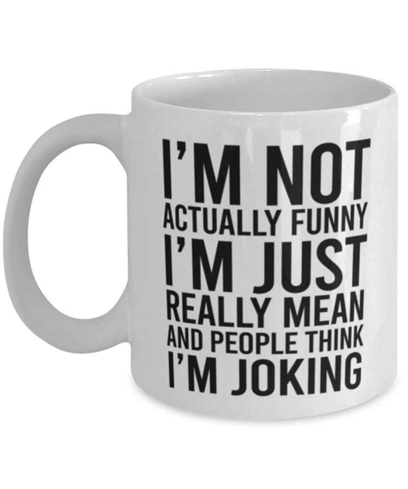 Sarcastic Coffee Mug I’m Not Actually Funny I'm Just Really Mean And People Product Details.. This high quality 11oz. ceramic white mug has a premium hard coat that provides crisp and vibrant color reproduction sure to last for years. Perfect for all hot & cold beverages. The highest quality printing possible is used. It will never fade no matter how many times you wash it. Material: 100% Ceramic. Print both sides. Dishwasher and Microwave Safe. High Gloss + Premium White Finish. Printed in the U.S.A. Personalized & Custom. We support personalized and custom mug to add custom, when placing an order, you can add notes to the "order note" in shipping address section. Also you can contact us directly via message. Shipping Info. Ready to ship in 1 to 2 business days, All products are made-to-order and proudly printed in the United States. Shipped by USPS and DHL, You will receive your order in 5-7 days. Replace & Refund. All products are defective during shipping broken, chipped will be replaced free of charge. You are not satisfied with the product, we will refund 100% money to you. If any other issues arise, please do not hesitate to message, we would be more than happy to assist you.