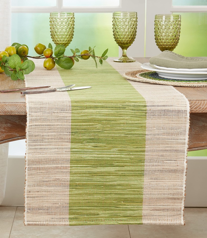 Featuring a natural background with soft tones that easily blend, the Shimmering Banded Table Runner is an inspired choice for every setting. The wide color band, in clear contrast with the backdrop, adds texture and depth to the tabletop. For a full effect, pair it with matching placemats or solid colors. Size: 16"x72" Design is not reversible Runner has no lining Two-tone design, adds beautiful contrast. Material: 95% water hyacinth - 5% polyester + Care: wipe clean with damp cloth