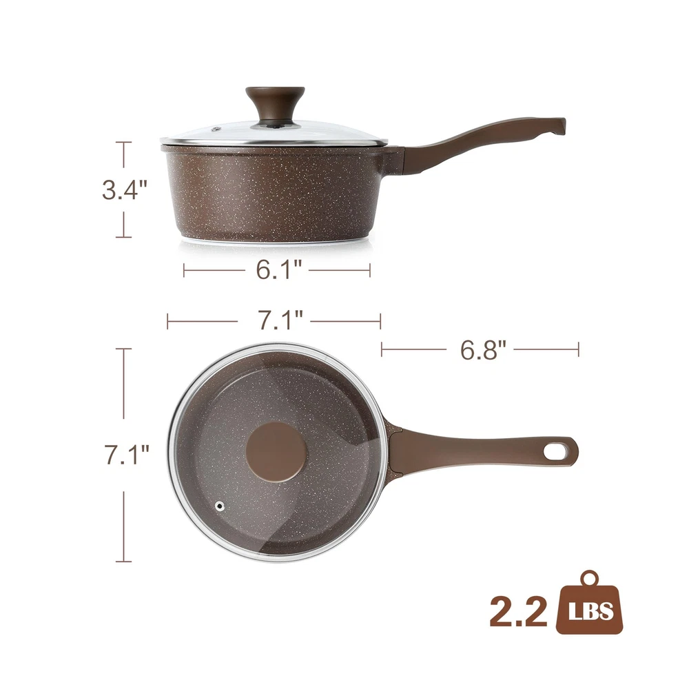 New Technology of Composite Coating - Improved harder granite,10X enhanced for long-lasting nonstick performance. PFOA free, smokeless, safe & healthy. Cooking with little oil for healthy diet. Suitable For All Stoves - High magnetic conductive stainless steel base allows the sauce pan to work on all cooktops, including induction. The core of small induction sauce pot is made of cast aluminum, which is sturdy and long-lasting. Heats up quickly and evenly. Versatile and Convenient - Size: 7.1" diameter, 3.4" deep, 2 Quart. This 2 qt sauce pot is convenient for small portions of soup, sauces, oatmeal, and grins. Ideal Size for 1-2 people meal and easy for storage. Unique lip rim design of the milk pan allows drip-free pouring. Glass Lid & Stay-cool Handle - Long-lasting tempered glass cover makes it convenient to see the cooking status and limits splashes on your stove. Woodgrain bakelite handle is comfortable to grip and stays cool while cooking. Oven safe to 302°F. Easy To Clean - Nonstick and no rivets, this induction saucepan with lid is super easy to clean. Simply wipe it over with a sponge and warm soapy water. Make your daily food intake easier to make.
