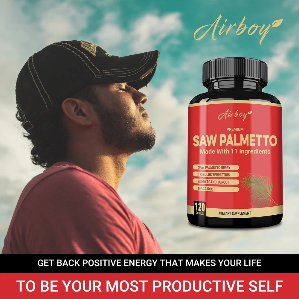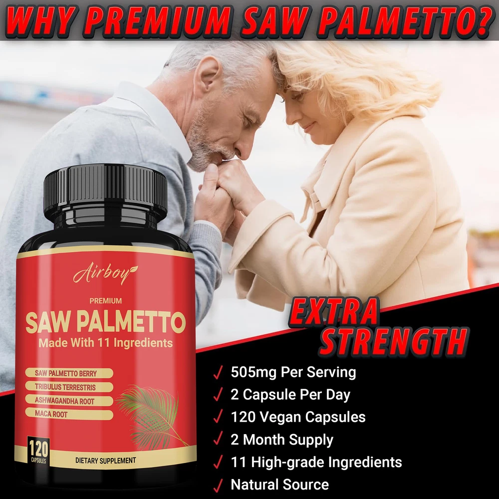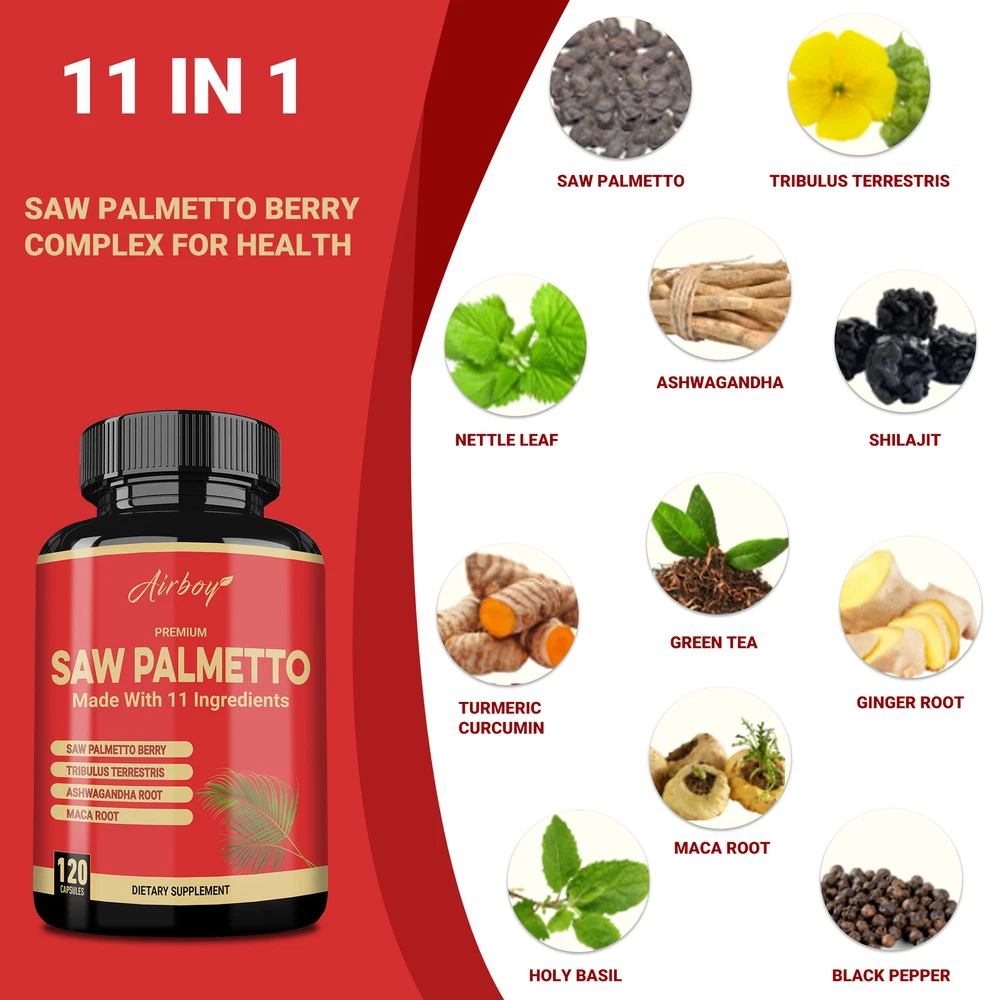 Effects: Energy & Endurance, Testosterone Booster Ingredients: Saw Palmetto,Tribulus Terrestris,Ashwagandha Directions: Take 2 capsules once daily after a meal. Shipping: Ships within 48 hours on working days. Shelf life: 2 years Description: Potent Saw Palmetto Berry Supplement, with Saw Palmetto Berry, Ashwagandha Root, Turmeric Root, Holy Basil (Tulsi), Black Pepper, Shilajit Powder, Nettle Leaf, Green Tea, Tribulus, Maca Root; boosts wellness. 11-in-1 Extra Formula Booster, High Absorption Saw Palmetto Berry Supplement; supports optimal prostate, calm mood, immune system and energy production for men and women. Herbal Saw Palmetto Complex maintains movement balance and a healthy lifestyle. Gluten Free, Non-GMO, Plant-Based, Keto-Friendly, Vegan. Document