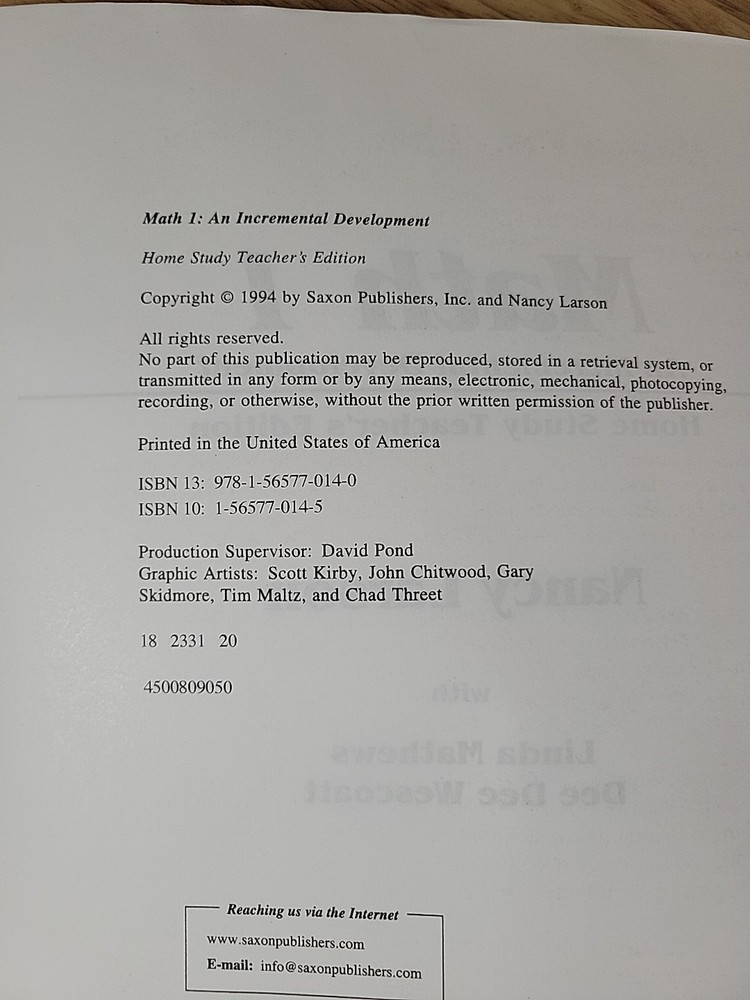 Saxon Math 1 Home Study Teacher's Edition by Nancy Larson 1994 Spiral-Bound