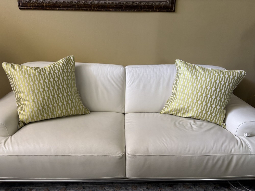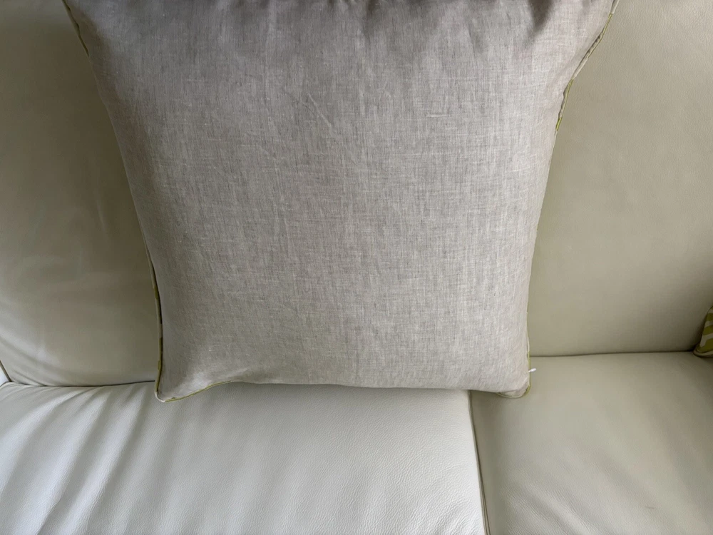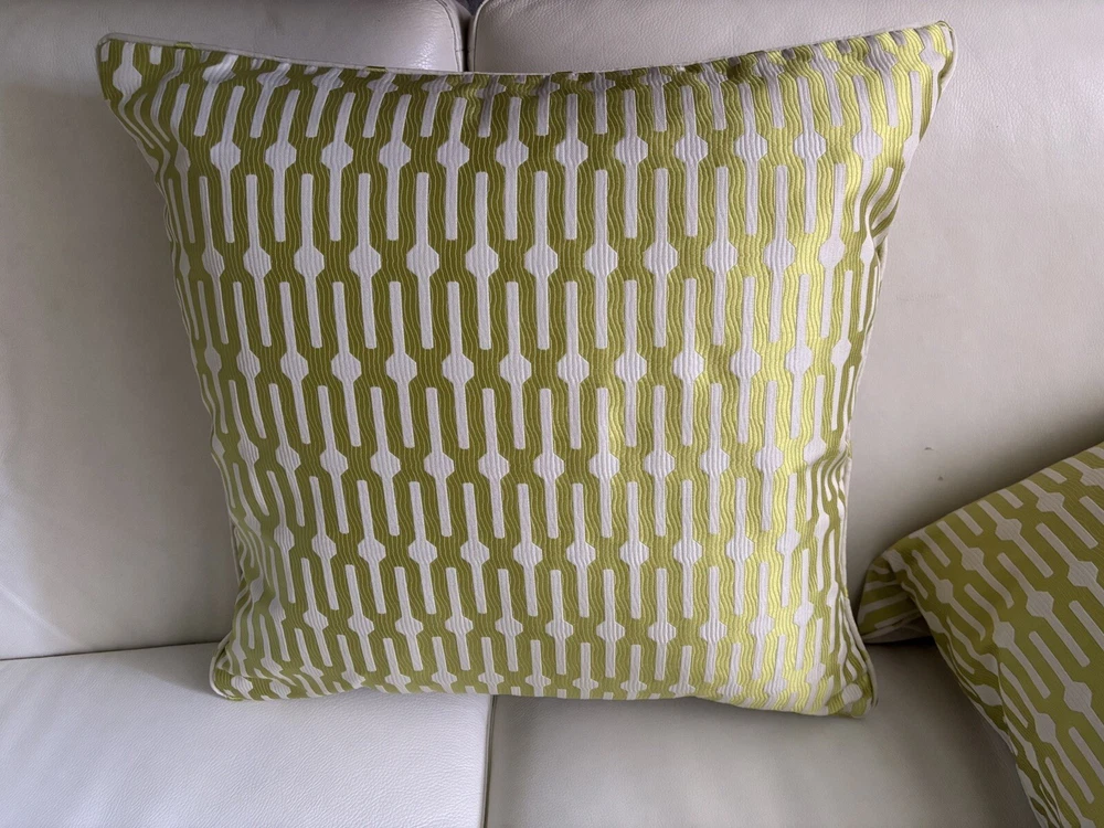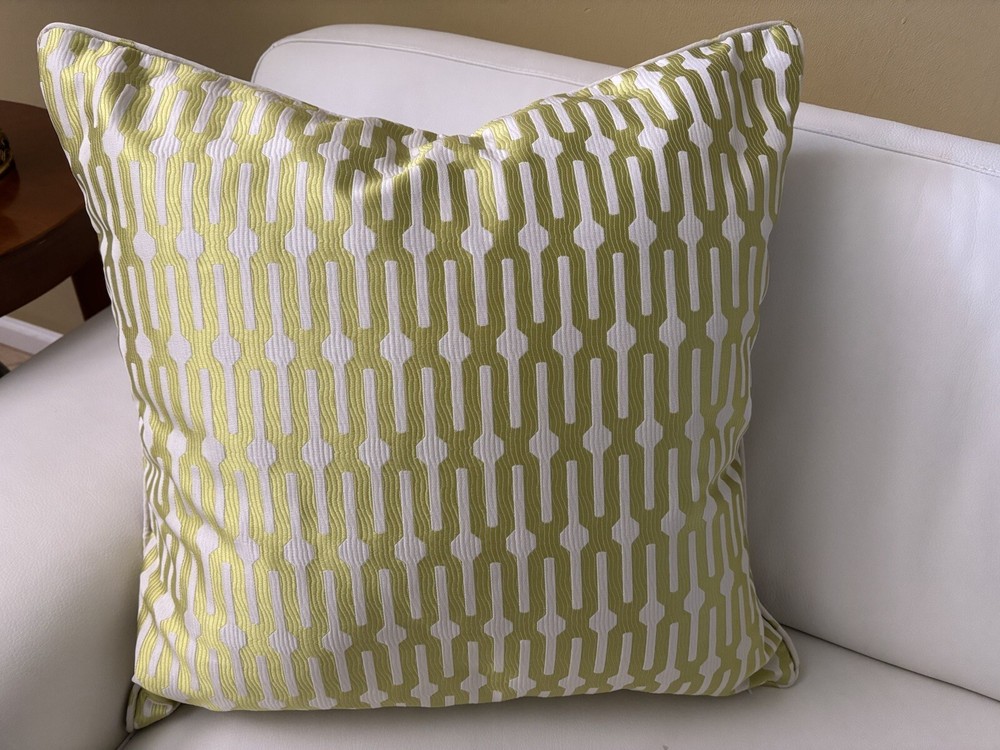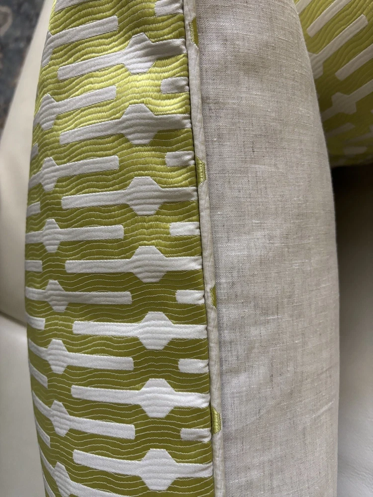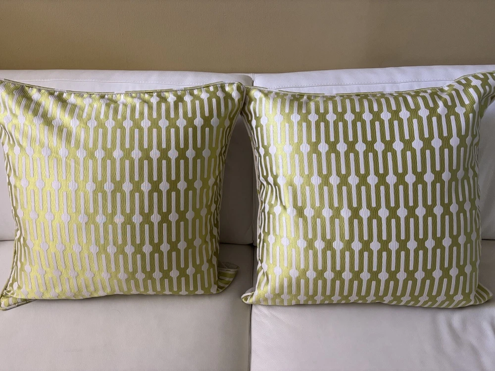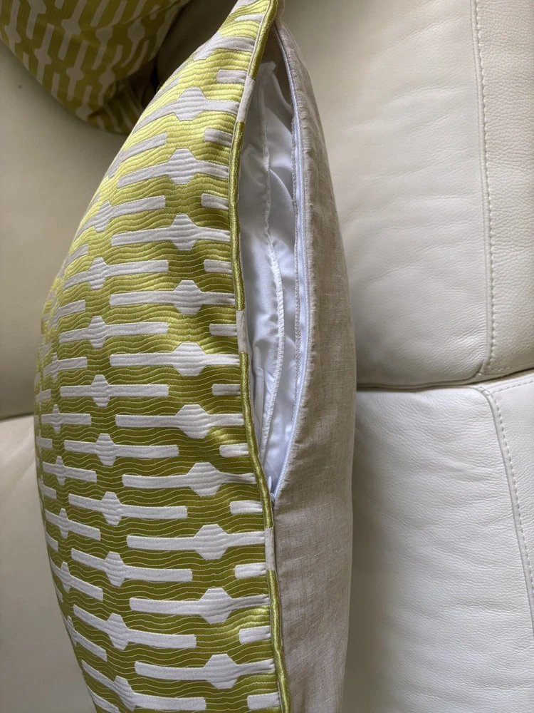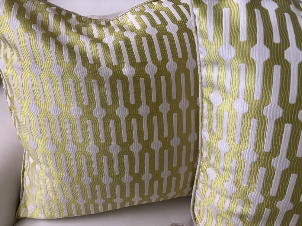 This pair of Scalamandre pillow covers features a geometric square design in beige and kiwi colors, made of silk/linen material with embroidered details. Measuring 24x24 inches, these decorative pillow covers have a modern multi-style and a hidden zipper closure for easy maintenance. The custom Scalamandre brand ensures high quality, and they are suitable for various rooms like the office, bedroom, living room, lounge, guestroom, or dining room. These are meticulously made by me in my workroom. Have worked for designers and had my own workroom. They have self welting, serged edges to avoid fraying and invisible zippers. - backs of pillow cover are of fine lined tan linen Measuring-20x20 Recommend hand wash Inserts not included Quantity- 1 pair
