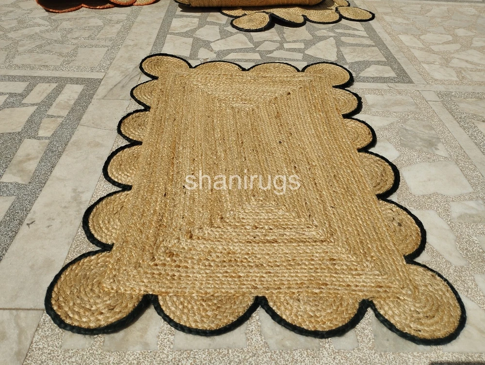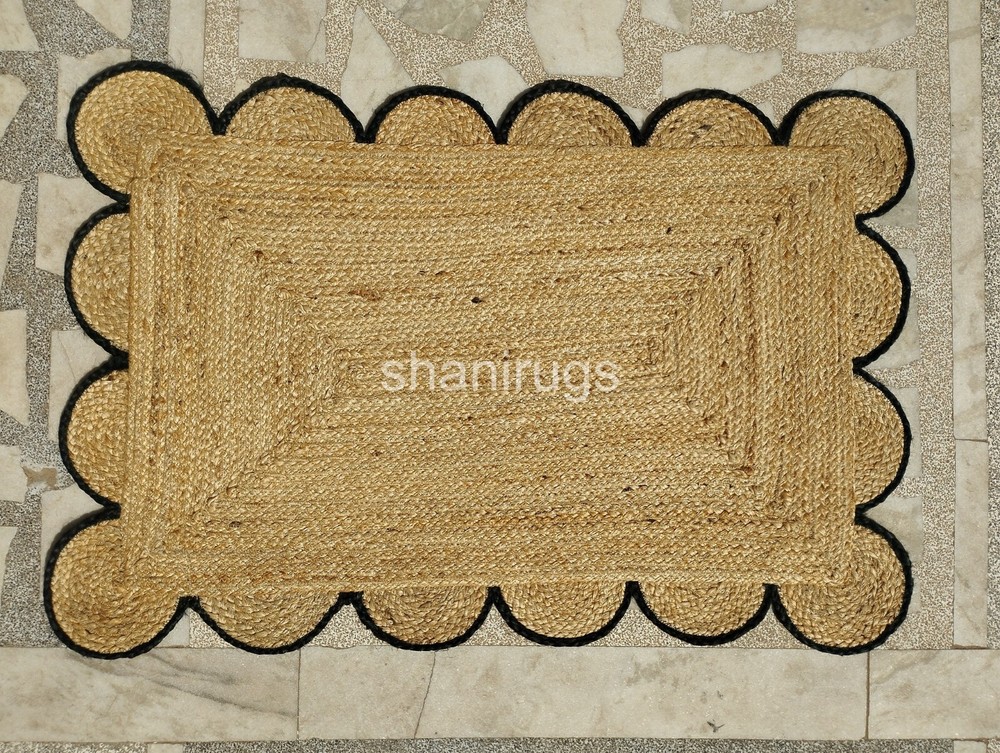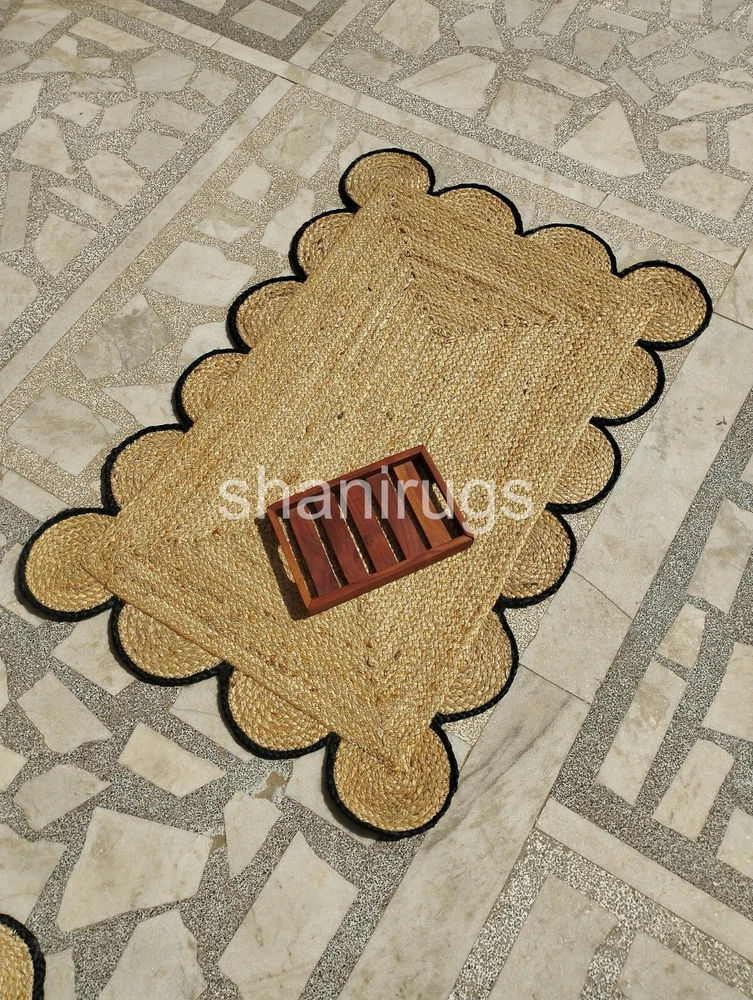 A scalloped jute rug features a natural, earthy design made from tightly braided or woven jute fibers, a plant-based material known for its durability and sustainability. The scalloped edges give the rug a decorative and elegant touch, softening its otherwise rustic appearance. Typically, these rugs come in neutral tones like beige, tan, or brown, which highlight the organic texture of the jute. The scalloped detailing adds a unique, artisanal look, making it an attractive accent for a range of interiors, from coastal and bohemian to farmhouse and contemporary spaces.