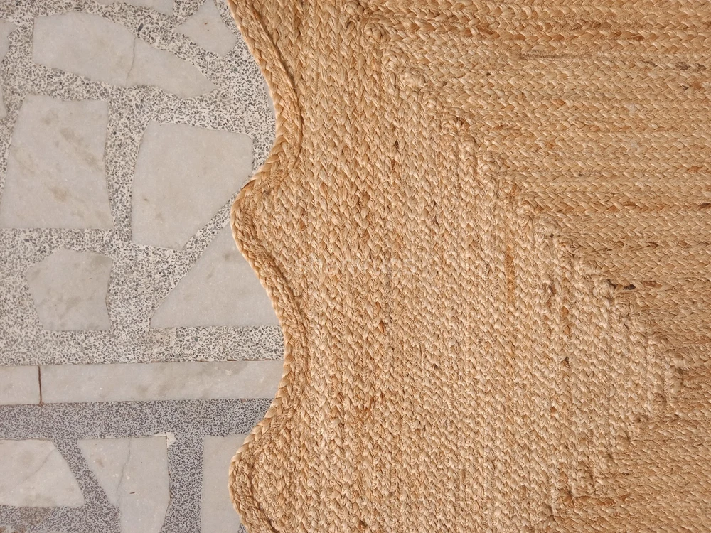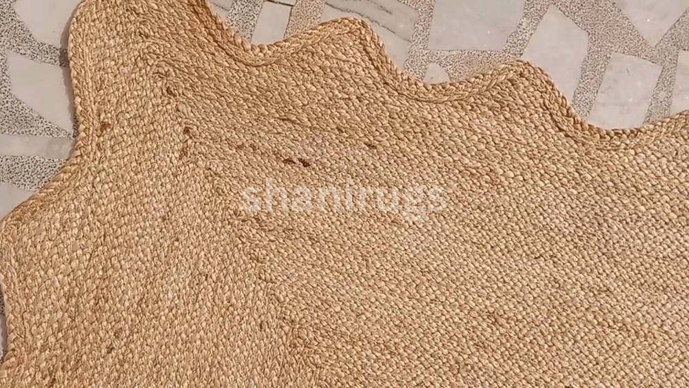 A scalloped jute rug features a natural, earthy design made from tightly braided or woven jute fibers, a plant-based material known for its durability and sustainability. The scalloped edges give the rug a decorative and elegant touch, softening its otherwise rustic appearance. Typically, these rugs come in neutral tones like beige, tan, or brown, which highlight the organic texture of the jute. The scalloped detailing adds a unique, artisanal look, making it an attractive accent for a range of interiors, from coastal and bohemian to farmhouse and contemporary spaces.