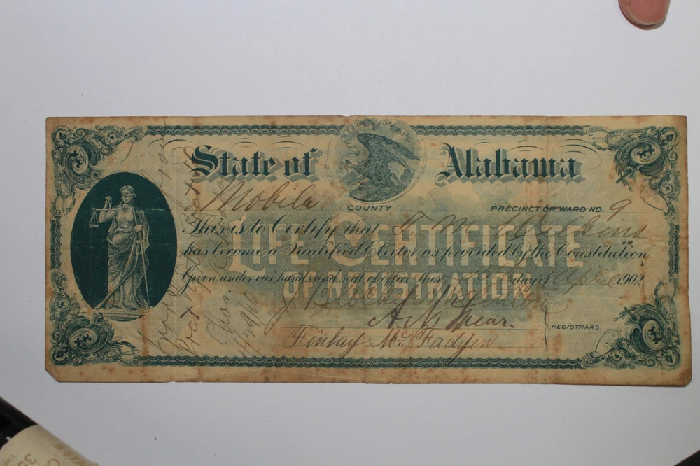 Scarce 1902 Historical Document: STATE OF ALABAMA Elector Certificate (#00009) Scarce 1902 Historical Document: STATE OF ALABAMA Elector Certificate (#00009) This Note: Scarce 1902 Historical Document: STATE OF ALABAMA Elector Certificate (#00009) Grades: Very Good / Writing on obverse / reverse Year/Series:1902 Please read our Shipping Terms & Payment Terms prior to making a purchase. We appreciate your business! Once you receive your item, if you feel that the item did not meet your expectations, PLEASE contact us right away. We want you to continue to be our customer, and we always strive for 5 Star ratings. Please see pictures for visual detail and if you have any questions do not hesitate to contact us! Don't forget to check out our store for more affordable fine jewelry, flatware, antiques, coins, currency, and misc. collectibles! Thank you for shopping with us! We take pride in our digital pictures and use a professional photography set up that includes natural flood lighting and neutral back flash strobes. If you need more photos please message us with your request. Grading: If you have questions about the numerical grade of a coin please contact us. EBay will not let us put a numerical grade in the listing but we are always willing to help. We guarantee our grades. ABOUT US: We are a small family business and appreciate each customer that has helped make our business a success! We are looking for long term customers so please contact us if you have ANY issues with your item. We only ask that you give us a chance to provide you with excellent customer service. In many cases, we get a less than positive feedback from a buyer that never tried to contact us before leaving the feedback. We are only human, mistakes happen, please be fair and honest, and we promise to do the same! We will pay your return shipping if we make a mistake with your order. Give us a try today!! SALES / PAYMENT TERMS: ALL STORE ITEMS ARE SUBJECT TO PRIOR SALE! We accept PayPal. RETURN PRIVILEGE: If there is a problem and an item is to be returned, please notify us prior to returning the item. We have a 30-day return policy. All returned items must be shipped back in their original condition within 30 days from the day you originally received the item for a full refund (Minus Sizing Fees on Rings). Items that have been altered or removed from their original packaging are not returnable. Returns are not accepted after 30 days. LISTING ERRORS: We reserve the right to cancel and fully refund an order if we find that there is an error in the listing. COMBINED PAYMENT TERMS: When you are paying online for combined listings, you must make one combined payment for all items. Add items to your cart, or make offers, until all items have been selected and/or all offers have been accepted, and then start the payment process. This will help ensure that all items arrive together, and that you are able to take advantage of any shipping discounts. SHIPPING: DOMESTIC SHIPPING ONLY! We offer FAST Shipping! We do not ship on weekends or on federal holidays. Please keep that in mind if you make a purchase over the weekend. We will promptly ship your item the following Monday (unless that day is a federal holiday). If you would like your shipment expedited please contact us for information. There will be additional fees for expedited shipping. NO INTERNATIONAL SHIPMENTS: We do not ship outside the US. COMBINED S&H DISCOUNT: We are happy to combine shipping on many of our items. Large or high value items may not be eligible for combined shipping. Please wait for us to invoice you before paying for multiple items. Multiple items must be put into the shopping cart, and purchased at checkout together to get your shipping discounts.