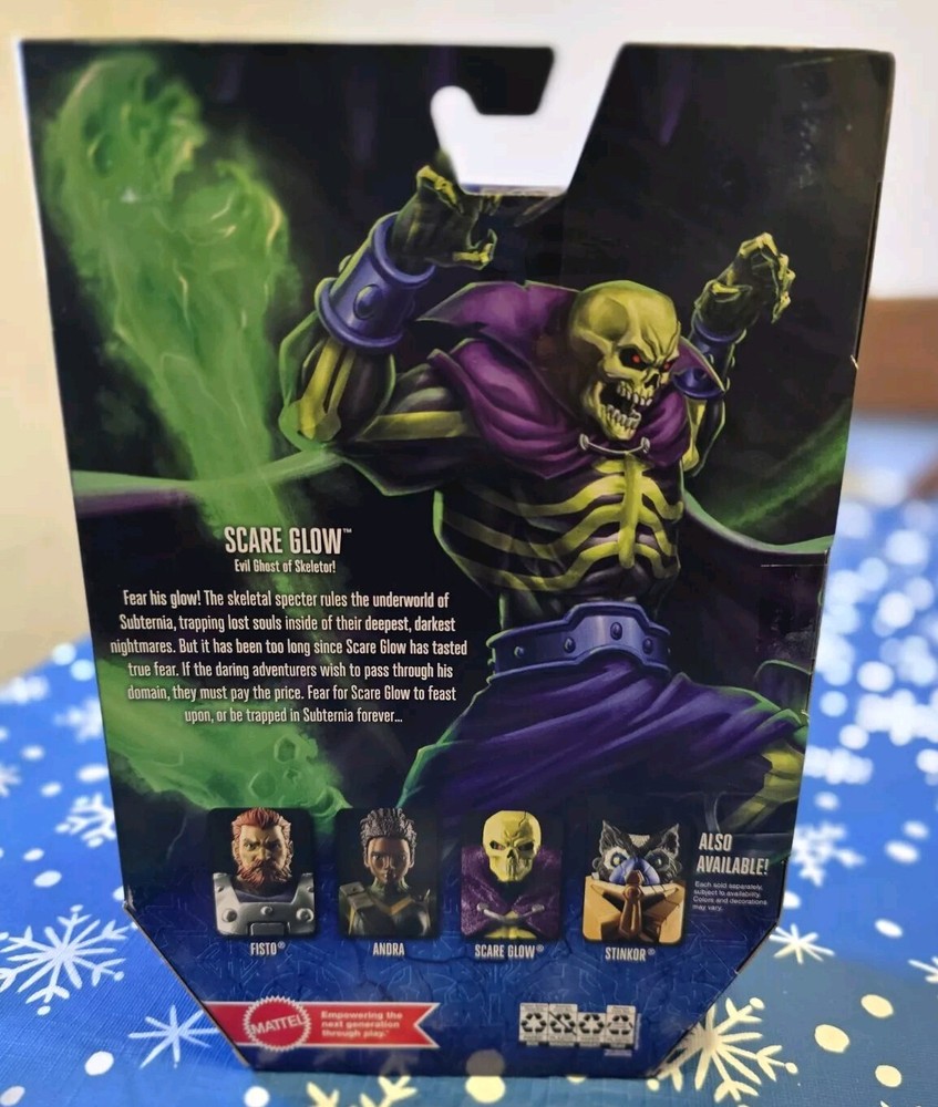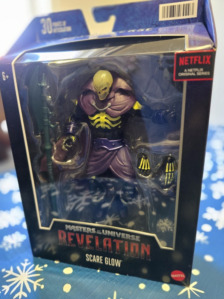 UNOPENED NIB The "Scare Glow" figure is a 1:12 scale action figure of a Merman character from the "Masters of the Universe" franchise, specifically from the "GLOW" TV show on Netflix. Made of PVC/plastic material, this multicolor figure stands at 7 inches tall and comes with clothes, packaged in a box. Produced by Mattel, this original item is part of the Masters of the Universe Revelation series, with a model number of MTHDR33. It also features a boxing sport theme.