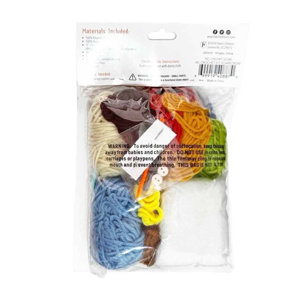 Needle Creations Scarecrow Crochet Kit 4.75”x9.5”x2.25” Complete Kit Polyester yarn Polyester Fiberfill “E” / 3.5 mm Plastic Crochet Kit Metal needle Plastic Needle Embroidery Floss Embellishments Instructions Shipped within one business day