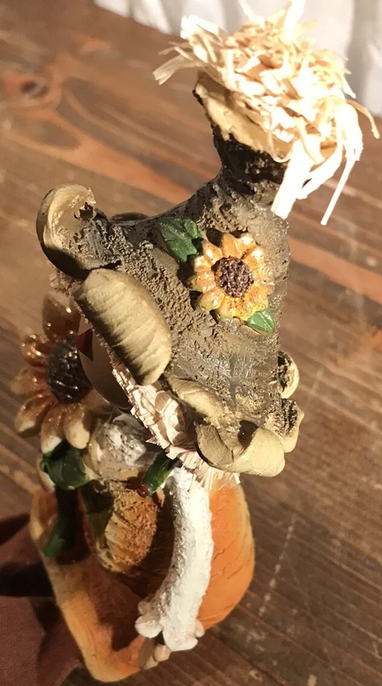 Add a festive touch to your Halloween decor with this Scarecrow Dangle Leg Figurine. Crafted with mixed materials including resin, fabric, and glitter, this multicolor figurine stands at 7-3/4 inches tall and features sunflowers and leaves. Perfect for any Halloween occasion, this figurine will add a holiday vibe to your display. Made in China, this Scarecrow figurine is a great addition to any collection. Measurements approximately: 7-3/4” tall with legs outstretched 5-1/2” tall sitting 2-7/8” wide 4-1/2” deep with legs outstretched 1-7/8” deep without legs outstretched