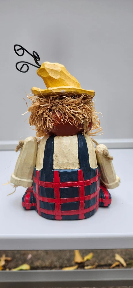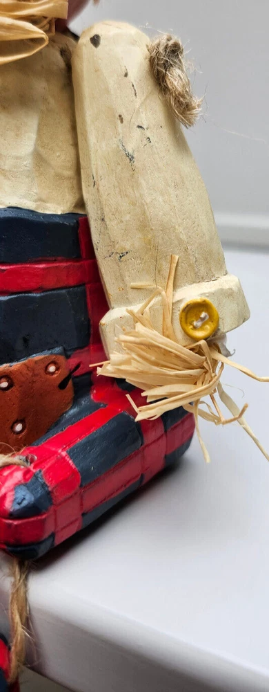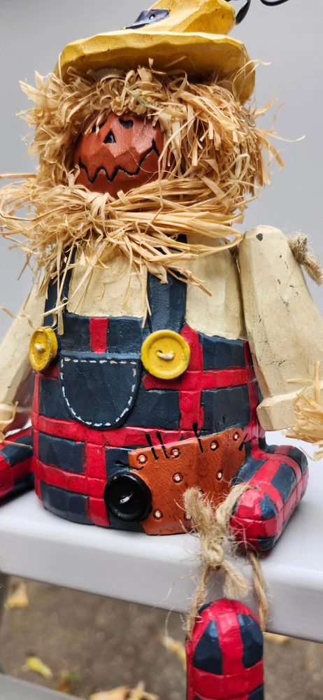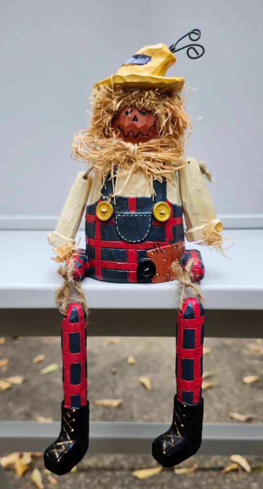 Scarecrow Shelf Sitter, Jack-o-Lantern Pumpkin Head, Vintage Dangling Legs, Patchwork Hat, Overalls. Cool Halloween Fall Decor. Cute piece! 🎃 11" tall x 5" wide