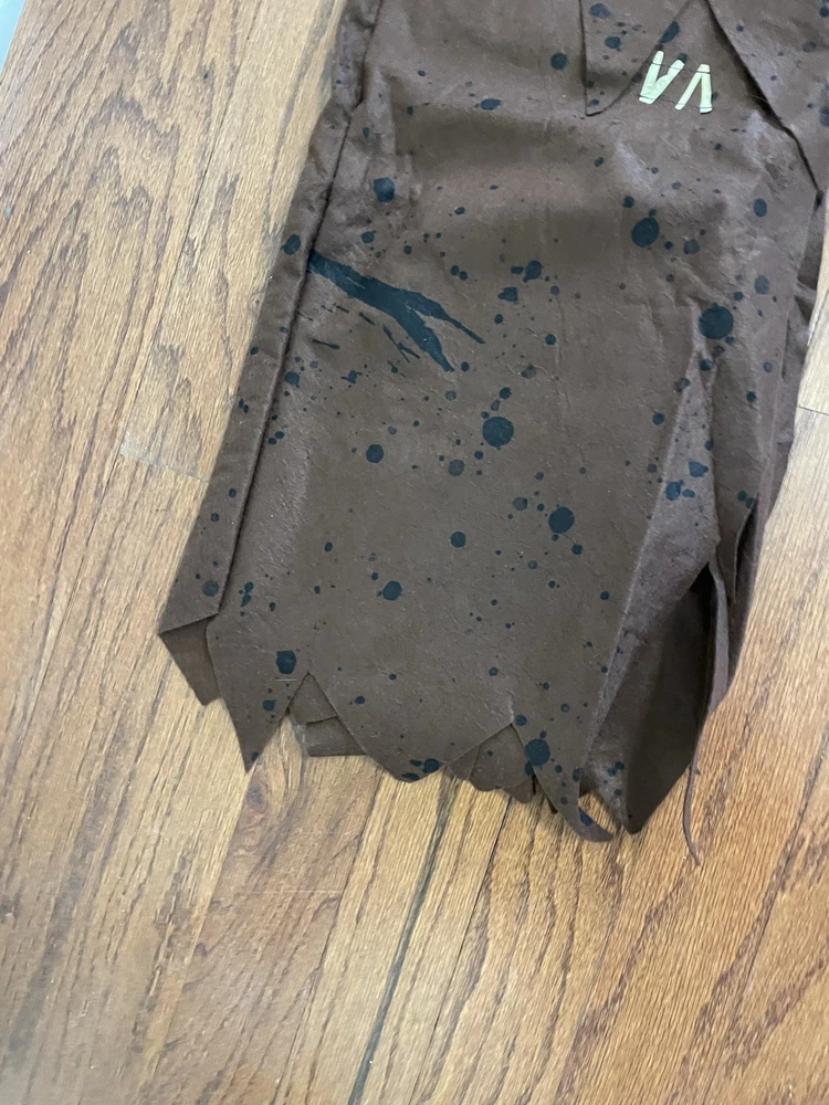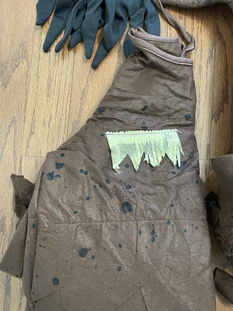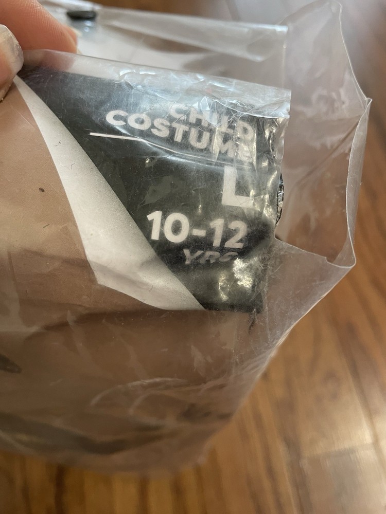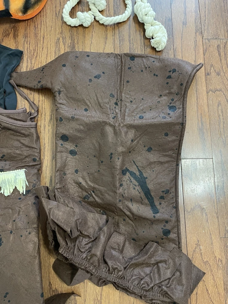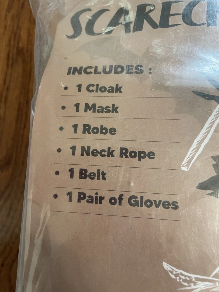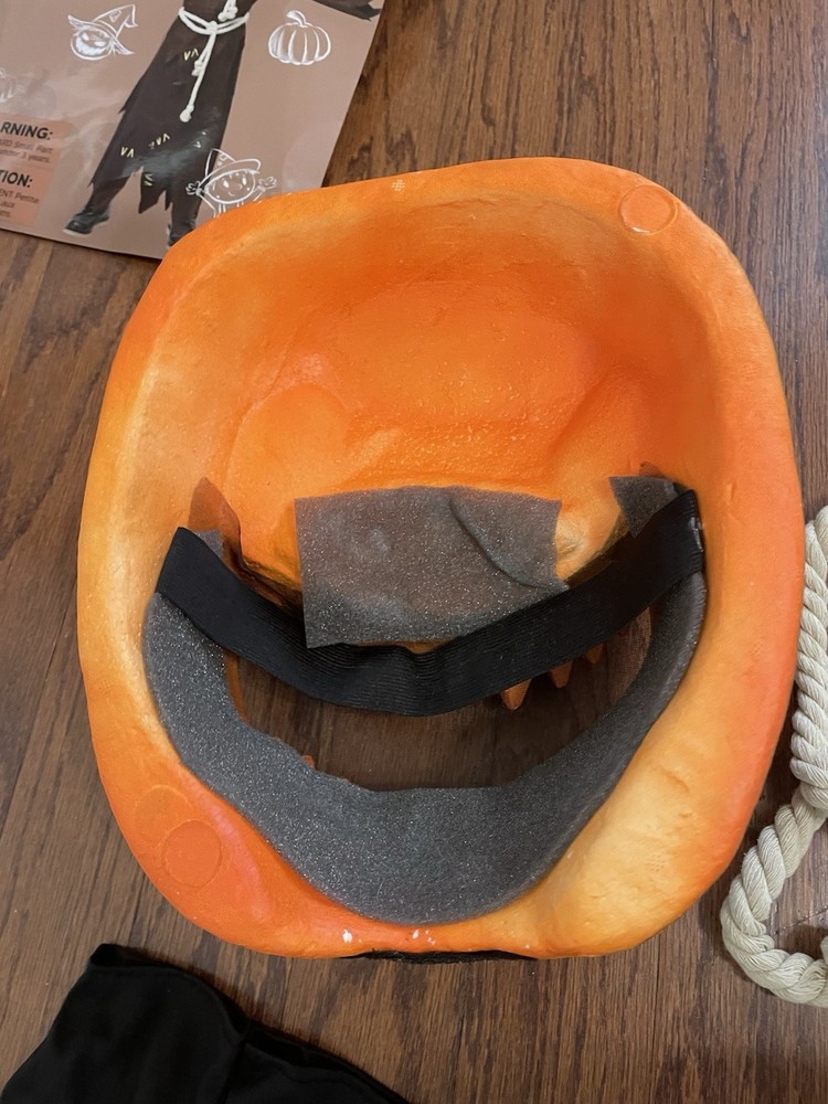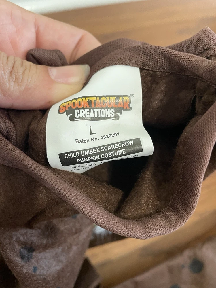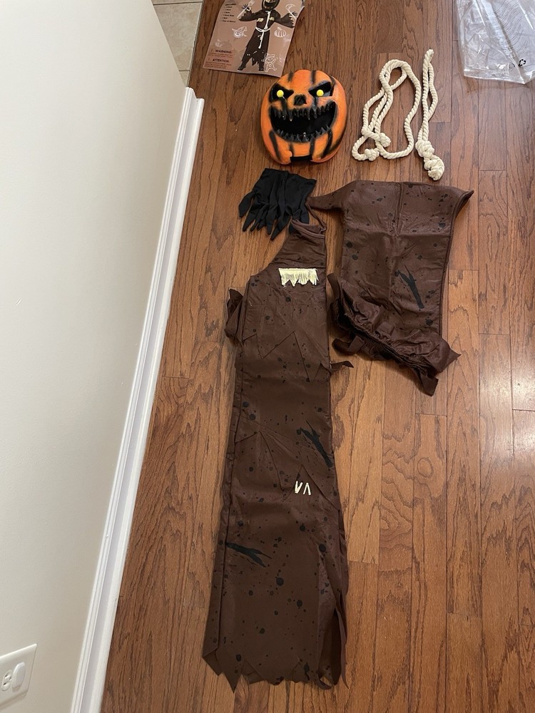 Scary Scarecrow Pumpkin Costume w/Pumpkin Mask Kids size L 10/12 NEW New, open package to show content. Does not include shoes. Wicked Scarecrow Pumpkin Bobble-Head Ghoul Costume Includes Brown Hood, Rope Collar, Evil Pumpkin Mask, Patchwork Dress Robe, Rope Belt and Scarecrow Gloves.