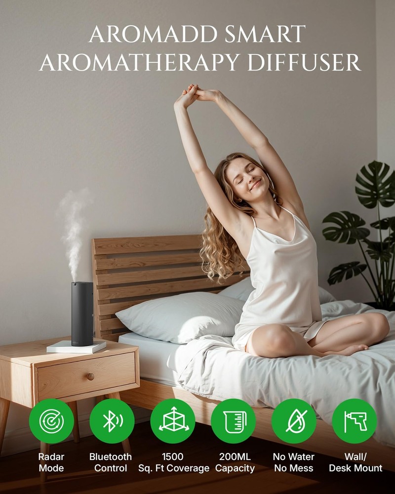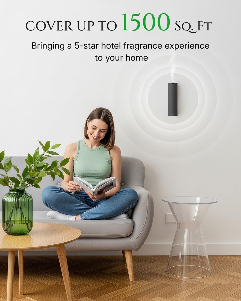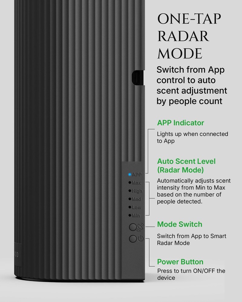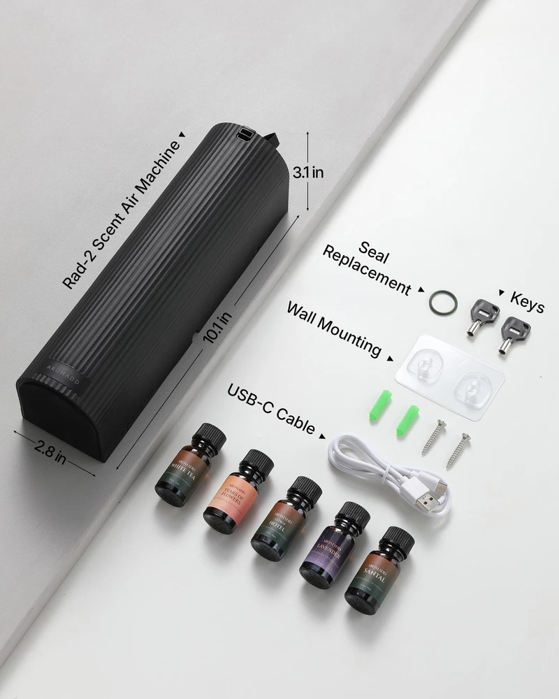 Experience 5-star ambiance effortlessly with Rad-2 waterless diffuser, transforming pure essential oils into ultra-fine dry mist—zero heat, zero water—for pure, enduring scents. Choose adaptive Smart Presence Mode (upgraded radar senses movement within 13 ft, auto-adjusting scent for crowds or solitude) or consistent Set & Savor Mode. Switch instantly via one-touch control or Bluetooth app for scheduling, intensity customization, and real-time oil monitoring. Effortlessly fragrance spaces up to 1,500 sq.ft.—ideal for homes, offices, and boutiques—with sleek wall-mount or tabletop flexibility. Includes 5 premium oils for instant exploration of fresh, calming, and sophisticated aromas. Where intelligent technology elevates every breath.Scent Air Machine for Home , Large Room Office TWO SMART WORKING MODES FOR EVERY MOMENT – The Rad-2 luxury cold air diffuser offers both Smart Radar Mode and Standard Mode. In Smart Radar Mode, this waterless scent diffuser detects human presence within 13 ft (4 m) and automatically adjusts aroma intensity based on the crowd. In Standard Mode, enjoy a steady, uninterrupted fragrance experience. Perfect as an essential oil diffuser for both dynamic environments and quiet, consistent home aromatherapy. NEW UPGRADED COLD AIR DIFFUSION : Using advanced cold filtered air + high-pressure atomization, the waterless diffuser transforms pure essential oils into ultra-fine dry particles without heat or water. This waterless diffuser preserves the full aroma profile for cleaner, longer-lasting fragrance. Covers up to 1,500 sq.ft., ideal as a hotel collection diffuser for living rooms, offices, spas, boutique spaces, or any large area. PERSONALIZED SCENT WITH APP CONTROL & OIL LEVEL MONITORING – More than just an oil diffuser, this smart aroma diffuser connects via Bluetooth to let you create advanced schedules — set operating dates, times, mist intensity, working time, and rest time. The APP also displays your remaining essential oil level in real time, so you’ll always know when to refill without opening the machine. Compared to ordinary diffusers for home, it’s smarter, clearer, and easier to maintain, giving you the ultimate customized scent journey. ONE-TOUCH MODE SWITCH – Instantly switch from Standard Mode to Smart Radar Mode with one press of the button on the device — no menus, no hassle. A convenient feature that makes this fragrance diffuser adapt to your lifestyle in seconds. WALL-MOUNT OR TABLETOP FLEXIBILITY – Sleek and versatile, this scent diffuser for home or office can be wall-mounted or placed on a tabletop, blending seamlessly into any setting — residential or commercial. BEGINNER-FRIENDLY AROMA STARTER KIT INCLUDED – Comes with 5× 10 ml premium essential oils. Specially curated for first-time users, this scent diffuser starter kit turns your aromatherapy diffuser into a home hotel scent system, letting you explore fresh and sophisticated fragrances right out of the box. USB-C POWERED – For stable performance, this diffuser must be connected to a power source. To reduce e-waste, a USB-C cable is included but no adapter. Only use a standard 5V adapter; fast chargers may damage the diffuser.