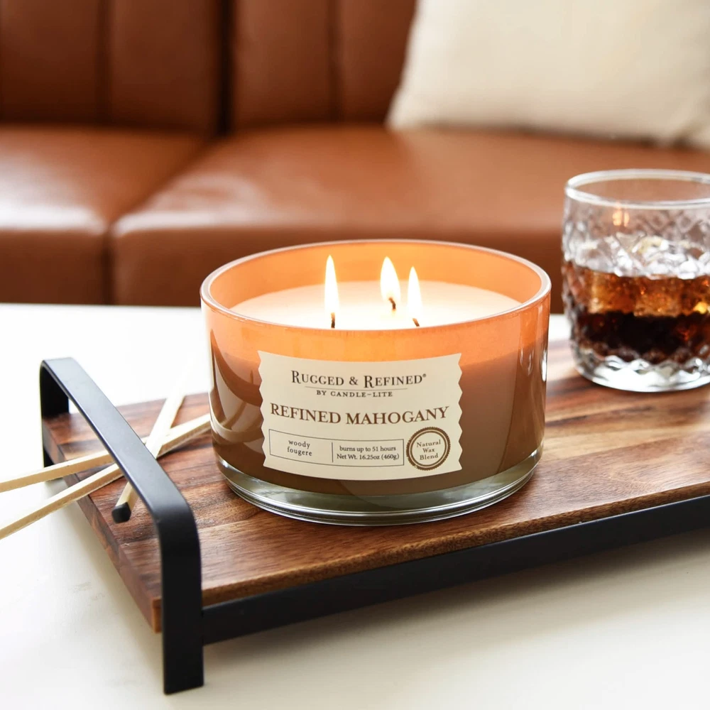 Discover a new line of masculine candles featuring sleek, earth tone, glass vessels, this collection of refreshing and bold fragrences elevates every room. Meet by Candle-Lite Company. Bring that warm and sweet scent into your home with this Refined Mohogany scented candle. This fresh scent offerswoody notes of strong mahogany wood, tree moss, spicy cedarwood, a touch of citrus, and warm amber making it one of the best candles for men & women. Measuring 5.35"L x 5.35"W x 3"H, this candle is the perfect size to place in any room. Enjoy a calming glow no matter where you are with this 16.25 oz. candle. Whether you’re working in your home office, enjoying game night with friends, or curling up on the couch for a movie night, this candle is perfect for any occasion. This 3-wick candle has three 100% cotton wicks, is lead free, and burns up to 51 hours. Not only does this white-colored paraffin wax candle accent your home décor, but it releases a calming fragrance while maintaining a consistent burn for you to enjoy. Always remember to candle with care and burn within sight. Keep candles away from children, pets, and things that can catch fire. Stop use when .5” of unmelted wax remains and extinguish every 4 hours for cooling. Trim the candle wick to .25” prior to each use. Lighting America’s hearts and homes since 1840, Candle-lite Company has been crafting quality candles in Ohio’s heartland for over 180 years. Create an inviting atmosphere with these candles for home scented with varied fragrances suitable for all the different rooms. Every Candle-lite product is 100% satisfaction guaranteed. Whether it's floral, fresh, fruity or gourmand, we have a fragrance for you. AROMATHERAPY CANDLE – This woody scent offers an escape deep in a mohogany forest with towering trees for miles making it one of the best candles for women & men THREE WICK CANDLE – This Candle-lite candle has a three 100% cotton wicks and burns up to 51 hours. Its white paraffin candle wax not only accents your home décor but releases a calming scent while maintaining a consistent burn. PERFECT FOR ANY ROOM – Bring that warm, woody scent into any room with this 16.25 oz. candle. Whether you’re working in your home office, enjoying game night with friends, or staying in for a movie night, this candle is perfect for any occasion. CANDLE WITH CARE – Always remember to burn within sight and keep away from children, pets, and things that can catch fire. Stop use when .5” of unmelted wax remains and extinguish every 4 hours for cooling. Trim the candle wick to .25” prior to each use. - Discover a new line of masculine candles featuring sleek, earth tone, glass vessels, this collection of refreshing and bold fragrences elevates every room.