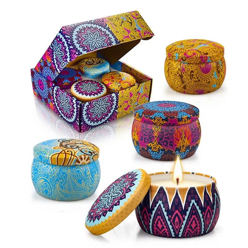 This Candle Gift Set includes 4 packs of scented candles, each weighing 4.4 ounces. The candles are made of natural soy wax and come in a classic round shape with a multicolor design. They are designed for both indoor and outdoor use, providing a long burn time of 25-30 hours. The candles are non-toxic, lead-free, and feature a stress-relieving aroma, making them an ideal gift for women during occasions like birthdays and Christmas. The set also includes an iron container with a glitter embellishment, adding a touch of elegance to the overall design.
