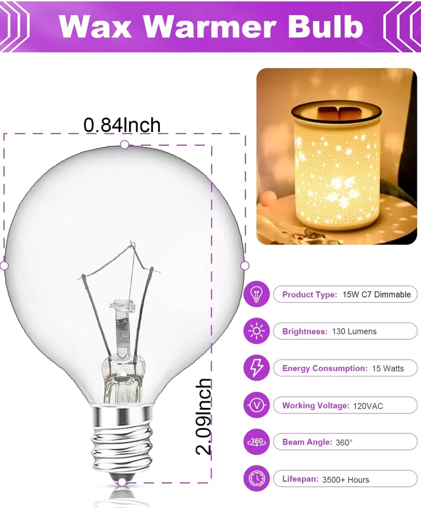 MULTIFUNCTION: This Light Bulbs can replace your original 25 watt light bulb for full size wax melt warmer, scented candle lamp, wax burner, etc.. NICE WAX MELTING ABILITY: This 25w wax warmer bulb is designed to melt scented wax melts and essential oil as well. The stable temperature generated by illumination can melt the wax and spread the fragrance throughout the space quickly, and create a comfortable and enjoyable atmosphere. WARM DECORATIVE LIGHTING: This light bulb not only is a safe heat source for melting wax, but also provides a warm white light. With its dimmable function, you can sleep tight at night without too bright and dazzling light. Product Description 25 Watt 120 Volt Replacement Bulbs for Full Size Wax Melt Warmers, Wall Sconce, Vanity Mirror Lights, Ceiling Lights, String Light. IMPORTANT NOTE: This bulb is adjustable and can be dimmed with a dimmer. However, the darker the light is, which means the less heat will be emitted, which may not melt the fragrant wax