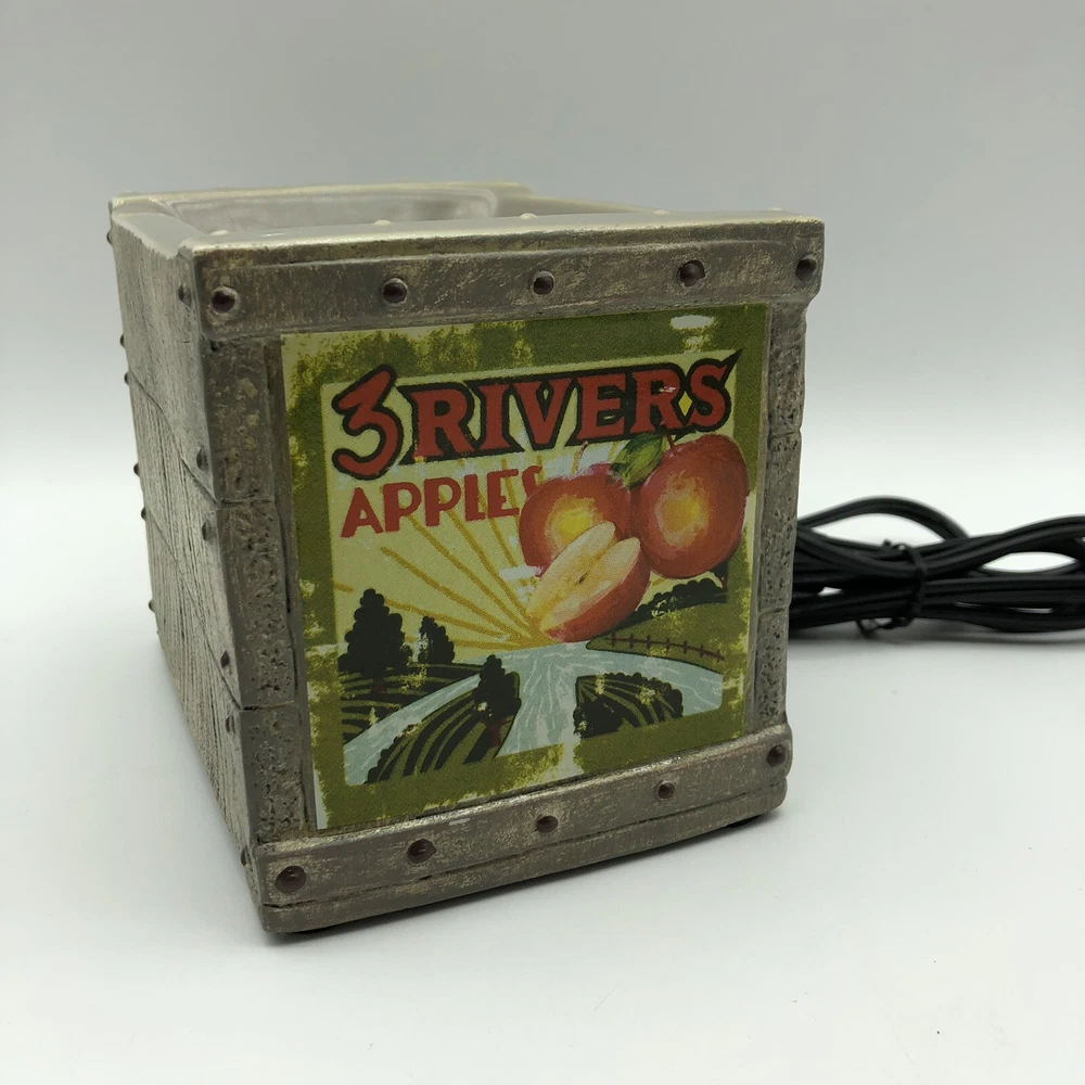 Scentsy Fruit Crate Element Wax Warmer Double Side 3 Rivers Apples Juicy Peaches Scentsy Home Fruit Crate Elemental Wax Warmer Electric Ceramic Gray Box 2 Sides/Ends Peaches Saying: Fresh Homegrown Juicy Peaches Apple Saying: 3 Rivers Apples New in Box Wear No damage, flaws or issues on warmer. Box is not in 100% perfect condition.