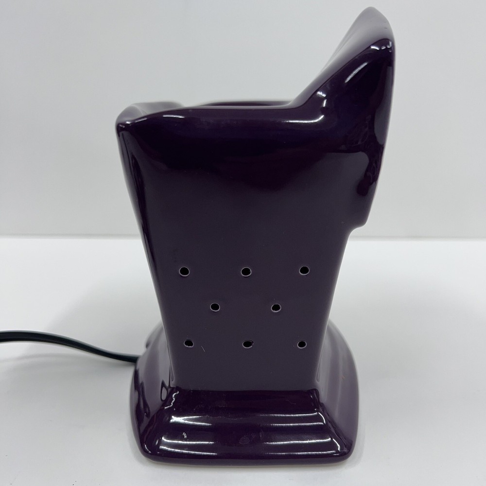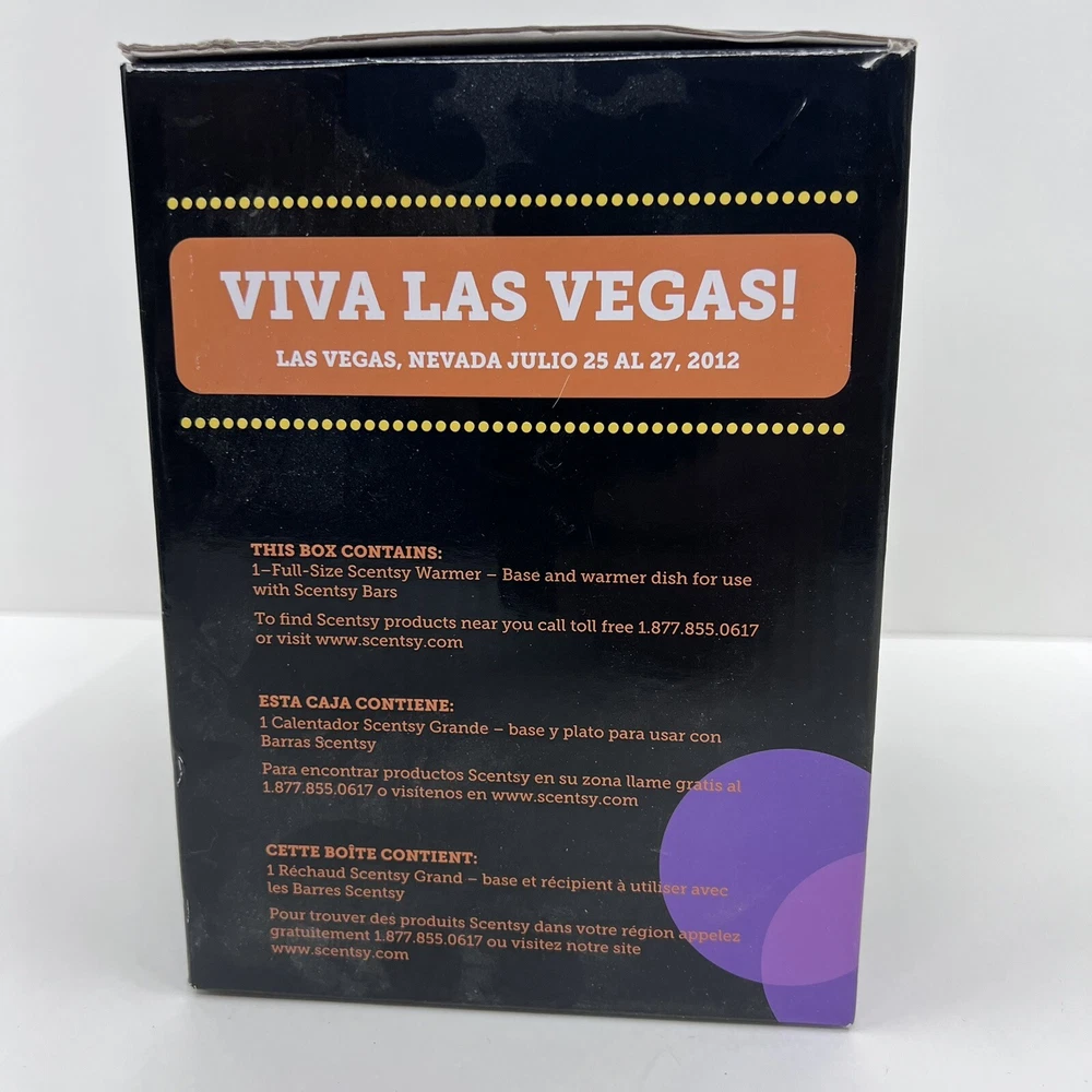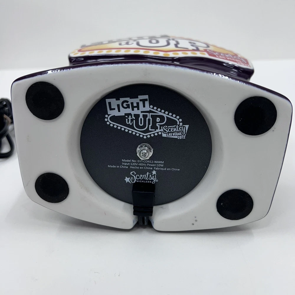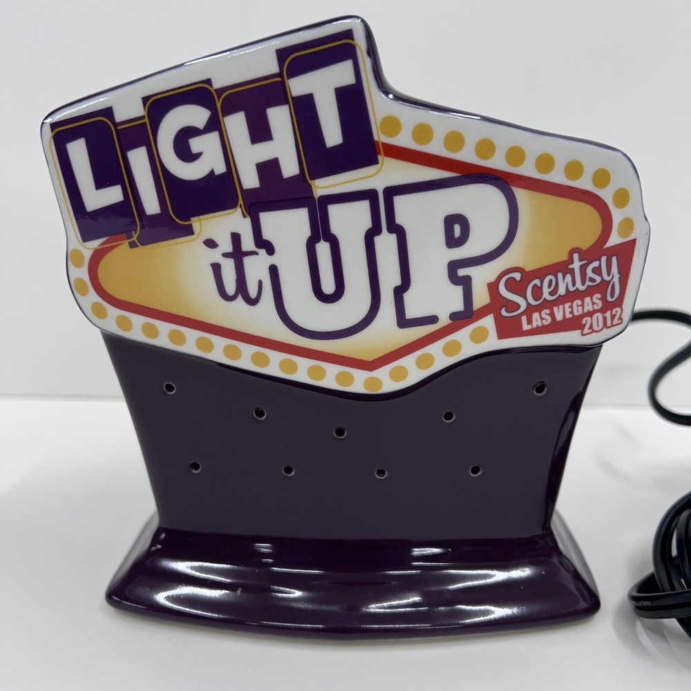 The Scentsy Light It Up Las Vegas Convention Full Size Warmer is a ceramic candle oil/wax warmer in a vibrant purple color, specifically designed for wall plug-ins. This art deco style warmer, with embellishments and a glossy finish, is perfect for creating an aromatherapy atmosphere in any room. The 2012 model weighs more than 40 oz and features a bowl design, making it ideal for adults looking to enhance their home fragrance experience with the Las Vegas theme.