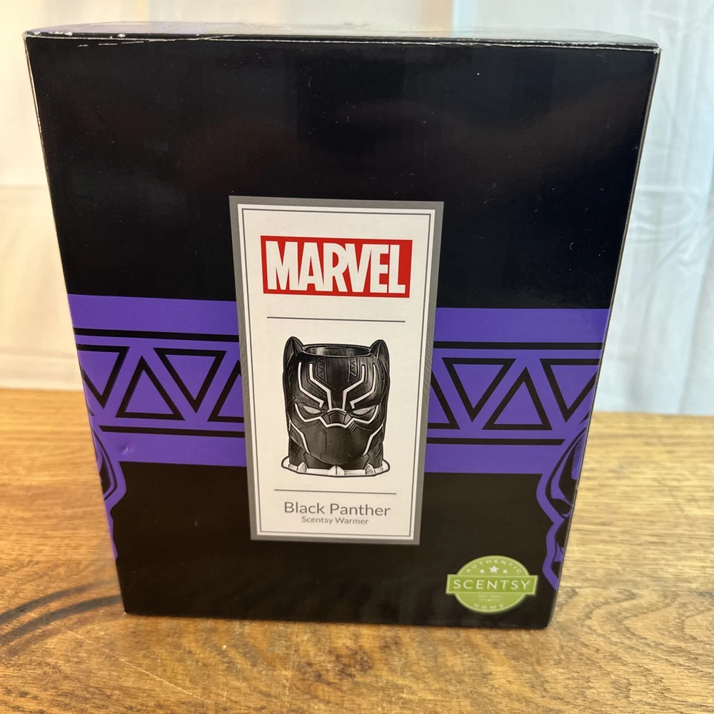 The Scentsy Marvel Black Panther Wax Warmer is a medium-sized container designed for wall plug-in use in any room, with a black color theme suitable for adults. This original Scentsy product features a superhero theme, making it ideal for aromatherapy in the bedroom. It is a deodorizer and odor eliminator that uses wax melts for a fragrant experience. Made in China, this matte-finished wax warmer is from the Scentsy Wax Warmer product line, perfect for adding a pleasant aroma to your home. New open box condition. Has been plugged in to test the light. See photos. Be sure to check out my store for other collectibles and vintage treasures.