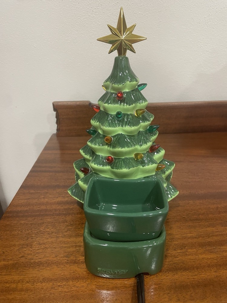 Elevate the festive atmosphere of your home with the Scentsy Merry Little Christmas Tree Wax Warmer. This large, multicolored ceramic container is a perfect addition to your Christmas decor, designed to bring the joy of the season into your space. The wall plug-in feature ensures that you can enjoy your favorite aromas without the hassle of a standalone burner. Crafted to be both a deodorizer and an odor eliminator, this electric oil/wax warmer slowly burns your chosen fragrances, releasing them seamlessly into the room. Measuring at an impressive 9.5 inches in height and 5 inches in width, it's an eye-catching piece that fits comfortably in any room, making it an ideal gift for adults who love to create a cozy, aromatic environment.