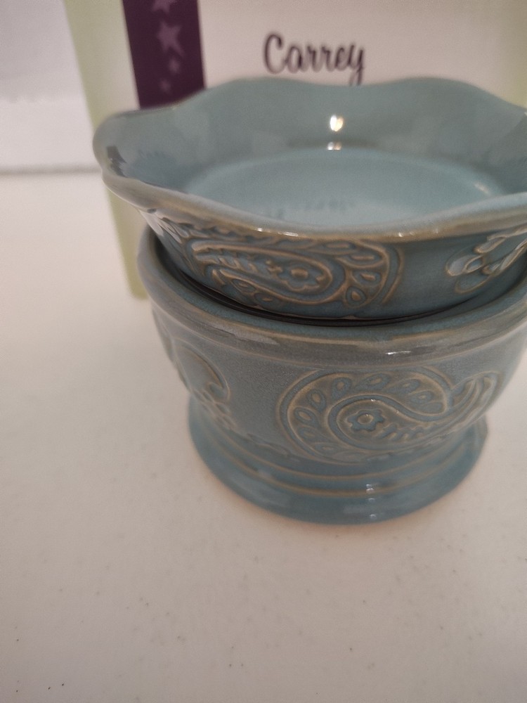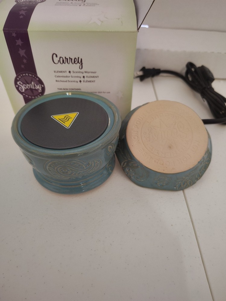 The Scentsy Warmer "Carrey" in Dusty Blue and Gold is a medium-sized electric oil/wax warmer designed for wall plug-in installation. This contemporary-style ceramic bowl features a glossy finish and is perfect for all occasions. With its deodorizing, slow burning, and odor eliminating capabilities, this Scentsy warmer is ideal for creating an aromatherapy experience in any room. Made in the United States, this multicolor warmer from the Scentsy brand is a stylish addition to any home.