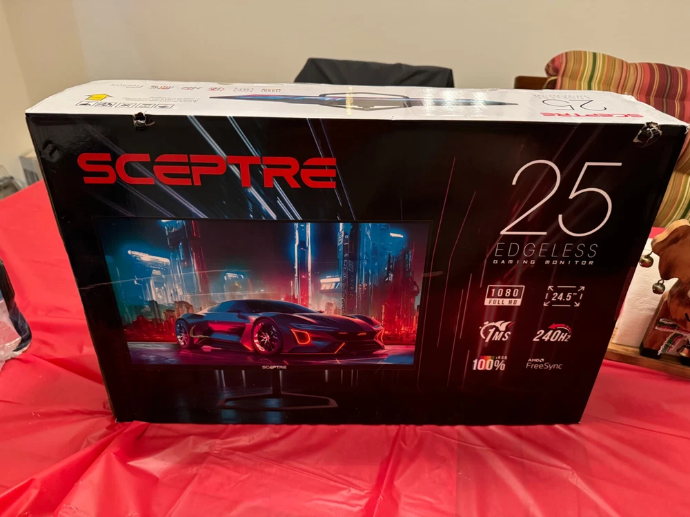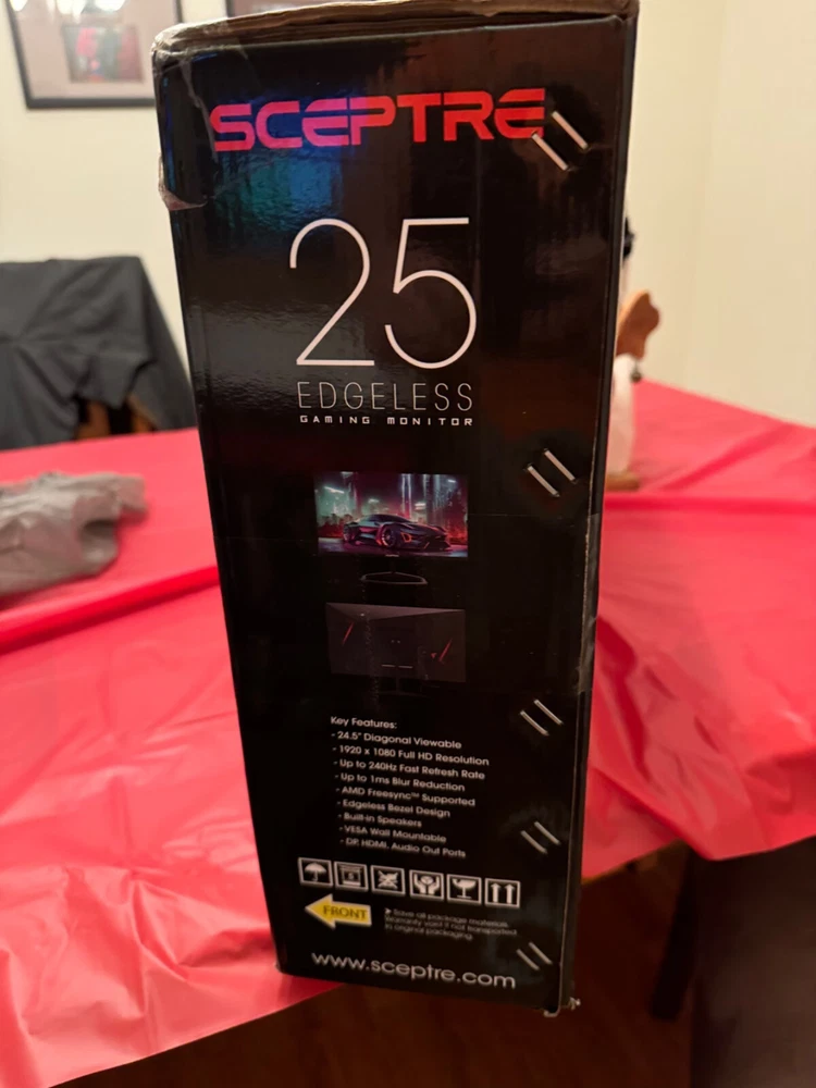 This is a Brand New in Box 25" Sceptre Gaming Monitor 1920 x 1080 Full HD, 240Hz Refresh Rate, 1ms Blur Reduction. AMD Supported Freesync , Edgeless Bezel with Built In Speakers. Supports DP , HDMI, AUDIO OUT PORTS.