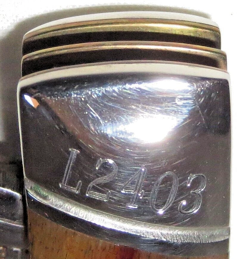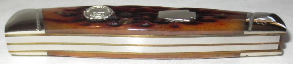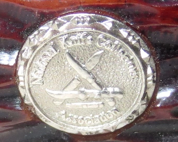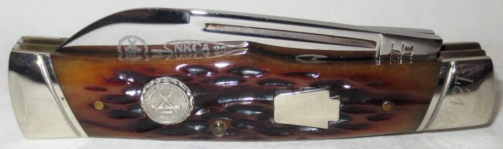 Jigged bone gunstock NKCA 2007 Club Knife marked Schatt & Morgan and Queen Cutlery Co.. New old stock but no box or papers. 3-1/2" closed, has brass liners & handle pins, nickel silver grooved slanted bolsters, "L2403" is engraved in the left front bolster, NKCA Club logo is inlaid in the left scale along with a 1/2" blank shield, and the knife weighs 3-1/4 oz. 2-3/4" spear point blade etched "NKCA 2007 CLUB KNIFE--ONE OF 725" with the NKCA trademark logo. It's tang stamped "S X M---TITUSVILLE---PA." on one side and "QUEEN CUT. CO.---TITUSVILLE, PA." on the other side. 2-1/4" clip point blade tang stamped "SCHATT & MORGAN". The knife has not been carried, used, or resharpened. Other collector knives listed.