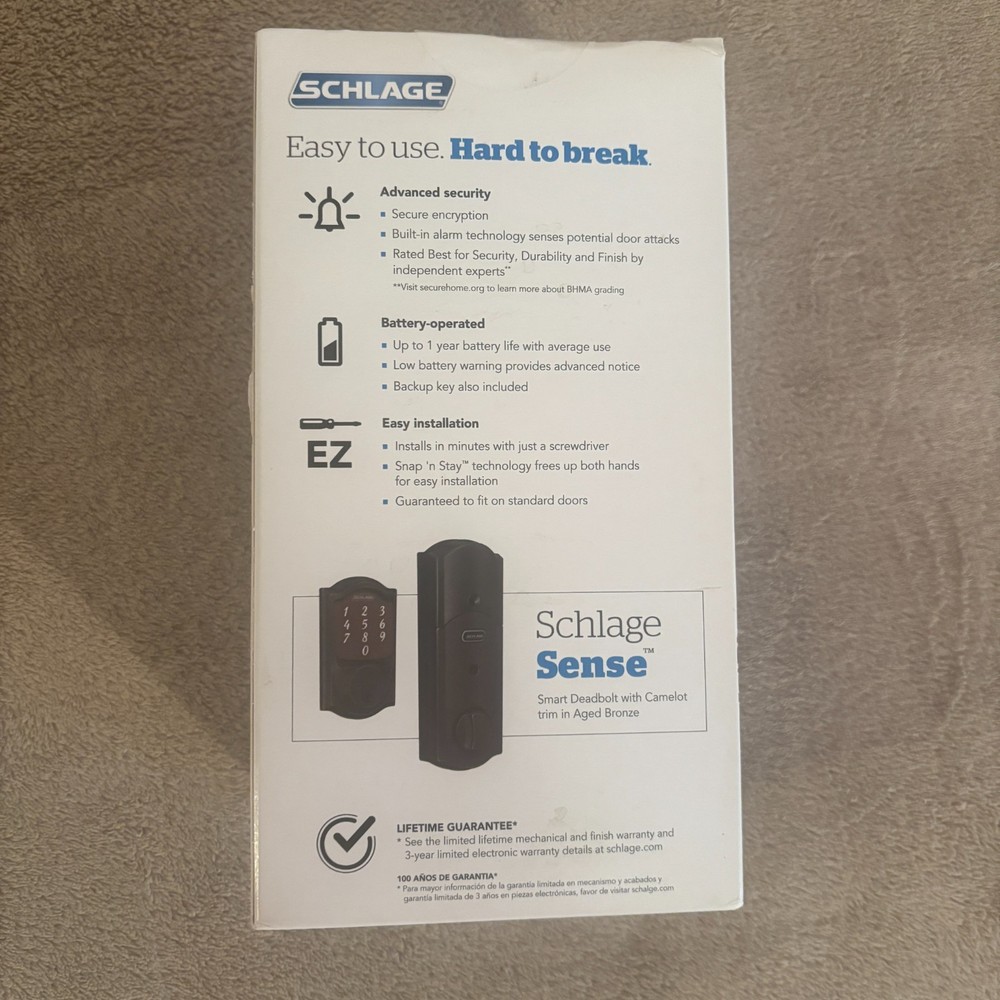 Refurbished Deadbolt Door Lock Schlage Camelot Sense BE479-CAM-716 Single Cylinder Smart Home Deadbolt Door Lock With Touchscreen - Aged Bronze Product Condition: Item is in good working condition It might be repackaged and has a manufacturer warranty. Could have a few minor blemishes and could be missing manuals/software and some accessories that are not needed for the functionality of the product. The Schlage Camelot Aged Bronze Sense Smart Lock is all about stylish convenience from the moment it leaves the box. Its illuminated touchscreen gives you easy accessibility, eliminating the hassle of fumbling around for your keys. Better yet, when you pair your lock with the Schlage Sense app you gain even more key-free opportunities. Additionally, the Schlage Sense Smart Deadbolt is compatible with Apple Home Kit technology - which allows you to talk to unlock your door using Siri on your iPhone, iPad or iPod touch. That connectivity puts you in greater control of your home, which means the Schlage Sense lock doesn't just make your home smarter - it makes your life easier. Available in the Camelot trim, the deadbolt suites perfectly with Camelot collection interior hardware. The Aged Bronze finish is inspired by traditional design, featuring warm, copper tones that break through its darker, aged exterior. Plus, it's been designed to meet the highest industry standards for strength and durability. Product Specs Model Number BE479-CAM-716 Product Name Schlage Camelot Sense BE479-CAM-716 Single Cylinder Smart Home Deadbolt Door Lock With Touchscreen Product Type Deadbolt Door Lock Color Bronze Finish Aged Bronze Commercial / Residential Residential Connectivity Bluetooth Door Handing Universal Door Lock Style Rustic Door Locks & Knobs Product Type Deadbolts Electronic / Mechanical Electronic Features Adjustable Backset, Alarm, Automatic Relocking, Backlit, Delay Timer, Easy Installation, Indicator Light(s), LED Backlight, Low Battery Indicator Light Hardware Included Deadbolt Hub Required Apple Homekit Hub Included Batteries Included, Drilling Template, Installation Instructions, Mounting Hardware, Self Guiding Screws Interior/Exterior Exterior, Interior Number of Batteries Required 4 Power Options Battery Remote Access Yes Requires Hub? Hub Required for Remote Access Security/ANSI Grade ANSI Grade 1 (Best Smart Home Smart Home Enabled Smart Home Protocol Bluetooth Tools/Hardware Collections Schlage Sense Trim Traditional Voice Control Hub Required Siri via Apple HomeKit Wired or Wireless Wireless Works With Apple HomeKit, Homey, Siri Certifications and Listings ANSI Certified Access Codes/Capacity 30 User Codes Cylinder 5-Pin Deadbolt Cylinder Design Style Camelot Door Prep 4 Inches Center to Center Minimum Door Thickness 1-3/8 - 1-3/4 Inches Fail Safe / Secure Fail Secure Latch Adjustable Bolt Dual Option Standard Warranty Warranty: Manufacturer warranty. For defective returns, Firesale Deals will give you a full refund and will arrange for and pay all shipping costs. Shipping Policy If we offer free ground shipping on a listing, it will be for the 48 Continental United States only. Shipping to Alaska, Hawaii and the US Territories will incur regular shipping charge as we cannot ship via the regular ground service. Freight delivery appointments may be required for oversized or heavy items. FireSale Deals is not responsible for any customs, duties, and/or taxes for international shipments. US and International government regulations prohibits marking merchandise values below value or as "gifts". Removing the product from the United States will void all warranties/guarantees. Please check with the product manufacturer to find out their international warranty terms. We cannot change the delivery address, nor cancel the order, nor set this up for a hold at the shipping company for pickup. If you refused the shipment or it is otherwise returned to us, it will be considered a non-defective return and you will be responsible for all shipping costs. Orders will leave our warehouse within 48 hours of your payment being cleared. We ship Monday through Friday, we do not ship on Saturdays or Sundays. We do not provide local pick up. Please Note: All International orders (including orders shipping to US territories) will be held for a period of 72 hours from the time of payment to insure payment is cleared. Payment Immediate payment is required, or within 5 days of auction closing. Returns We have a 30 Day Return Policy and most products have the Manufacturer Warranty against defects. Please contact our Customer Service team if you have any issues with your item and to obtain an RMA number. You can return an item purchased within 30 days of the original purchase date. You must return the product in its original packaging (or equivalent) that was shipped to you, prepay shipping charges, and insure the shipment or accept the risk if the product is lost or damaged in shipment. For non-defective returns, you are responsible for the original and return shipping costs. If you refused the shipment or it is otherwise returned to us, it will be considered a non-defective return and you will be responsible for all shipping costs. If your product happens to be defective and the manufacturer warranty applies, please contact the manufacturer for assistance. You can contact us if you need help working with the manufacturer, or to request an RMA to return the item back to FireSale Deals. A pre-paid return label will be emailed to you when the RMA for a defective return is approved. If FireSale Deals cannot reproduce the reason for a defective return, you will be responsible for all shipping costs. In the event that a product received by the customer is defective and the product has been removed from the country after delivery within the USA (regardless if the item was shipped to a freight forwarder, international mail forwarder or a family member), the warranty/guarantee is no longer valid. The customer must return the