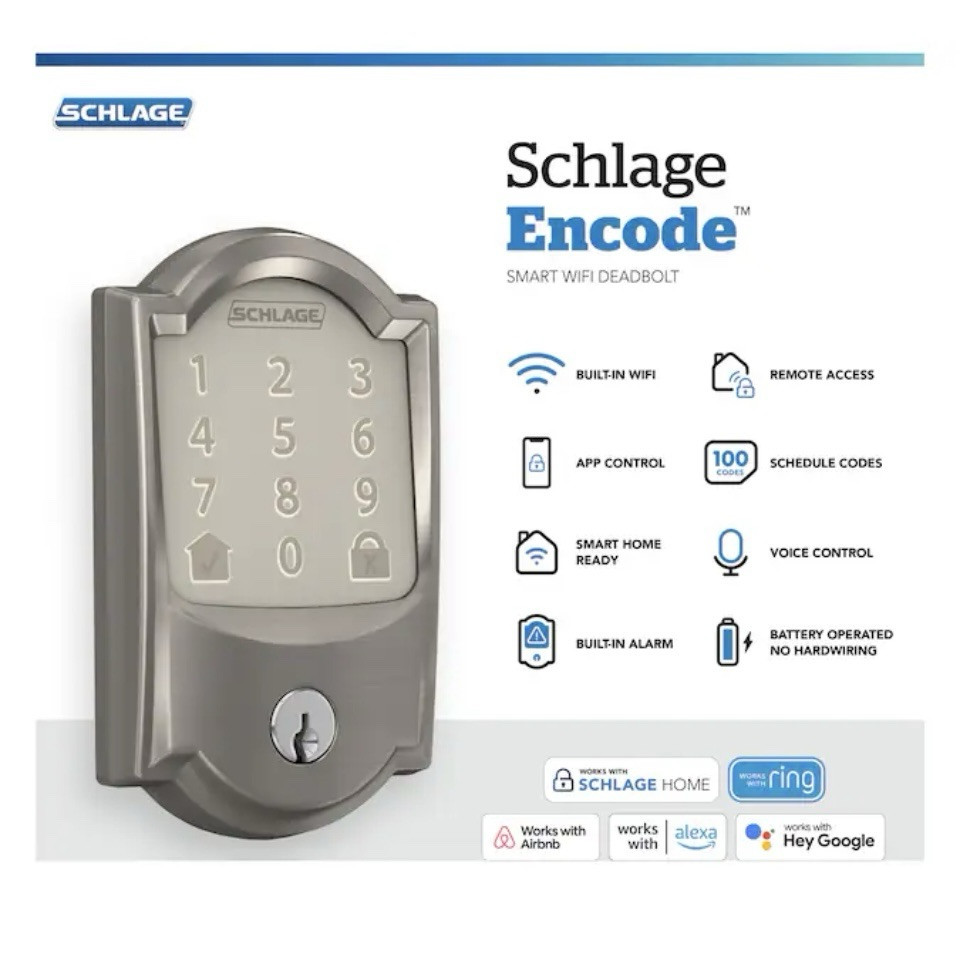 The Schlage Encode Smart Wi-Fi Deadbolt in Satin Nickel is a contemporary-style deadbolt suitable for residential front entrance doors. It features an adjustable backset, electronic functionality, and comes with a key for added security. With universal mounting, this Schlage Encode model offers convenience and peace of mind for homeowners looking for a sleek and modern lock solution.