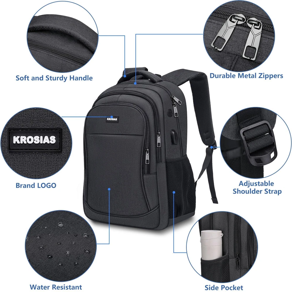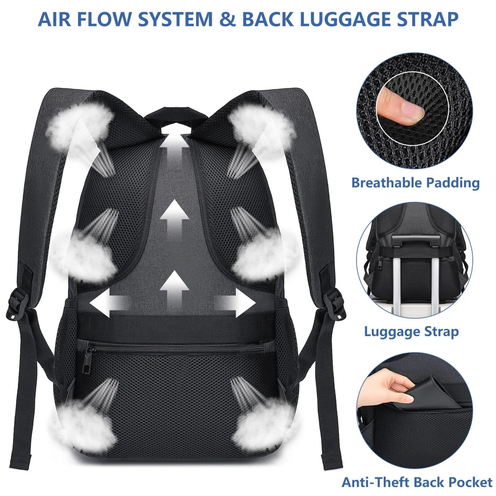 Suitable for various occasions College Backpack, high school backpack, middle school backpack, Business backpack, computer backpack, laptop backpack, office backpack, travel backpack Specifiations Dimensions: 18.1 X 12.2 X 6.9 IN Weight: 1.76lbs Capacity: 35L Department: Unisex Closure Type: Metal Zipper Material: Waterproof Polyester Laptop sleeve with velcro, ideal for 12", 13.3", 14", 15", 15.6" laptops. Guide of Bag's Size 15.6 inch bookbag is ideal for people of height from 4.2ft to 6.3ft. Package Include Backpack x 1 USB Cable x 1 【Large Capacity & Organized】Size: 18.1 X 12.2 X 6.9 IN. 35L. One separate padded laptop sleeve that fits 11 to 16 inch Laptops/Tablet/Notebooks. 3 spacious compartments roomy for clothes, books, iPad, mouse, charger, file folders, etc. Zippered pocket inside make your items organized and easier to find. The Bookbag meets Airline's Requirements, putting it under the seat is allowed. 【Charging and Listening】The Charging backpack with an external charging port & built-in charging cable provides you a more convenient way to charge your electronic device via connecting your own power bank while walking or cycling. The headphone jack gives easy access to earphone usage. 2 ways for you to choose. (POWER BANK is not included) 【Breathable and Ergonomic】Padded and breathable mesh back panel of this computer backpack helps with ventilation, air convection, and heat elimination. Ergonomic design of S-shape padded shoulder straps help relieve the stress of the shoulders. 【Safety and Convenience】Zipper with the metal matte pulls slides easily and smoothly. Luggage sleeve allows the schoolbag to fit on the suitcase, great for international travel or business trips. Hidden anti-theft pocket protect your valuables from stealing. Key clasps and pen pockets are suitable for internal storage. 【Waterproof & Unique】The School backpack is constructed with waterproof and scratch-resistant oxford fabrics for protection in light rain, and features heavy-duty two-way zippers on both sides of the backpack for easy access. Ideal for weekend getaways, shopping & outdoor activities in daily life. Our laptop backpack is a good choice for Students. (Age: over 3 years old)