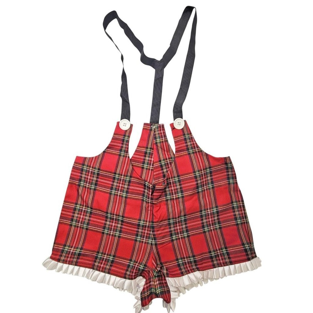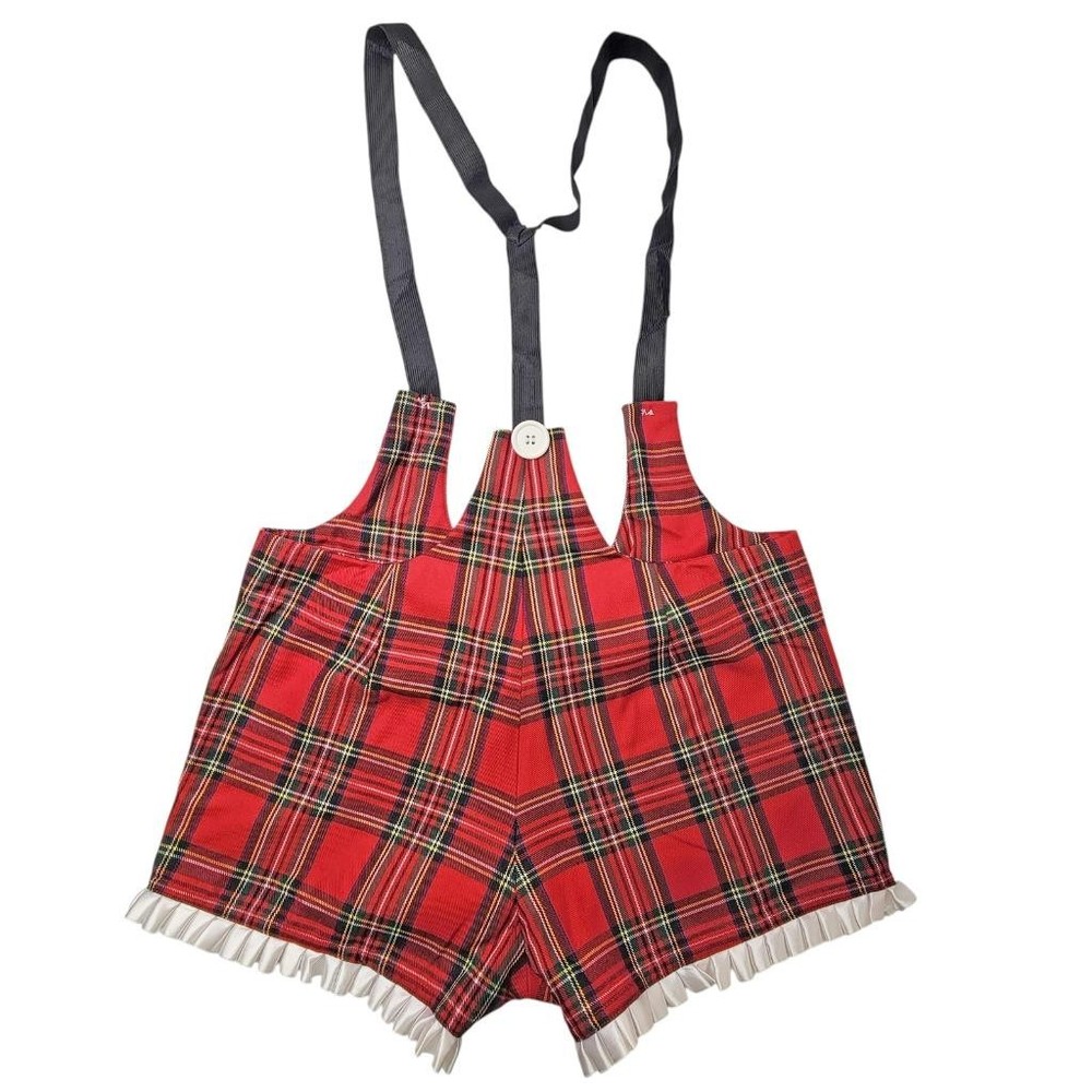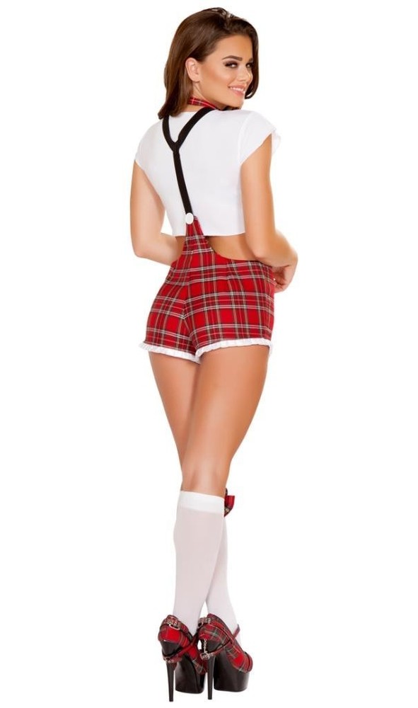 Teachers Pet school girl costume includes short sleeve tie front crop top, and high-waisted plaid shorts with ruffle trim, attached elastic suspenders with faux button detail, and zipper front closure. Two piece set. Choker and hosiery sold separately, purchase together and save. Genuine Roma Product. While lying flat, size M shorts measure about: -10" down the side -10" long down the front middle where the zipper is to the middle of the crotch -16.5" across the top of the shorts -18" across the middle hip area -20.5" across the bottom -27" long from top of the elastic strap to the bottom of the shorts -11.5" long straps without any stretching -15" long from the button to the ruffle and from back button to crotch While lying flat, top measures about: -13.5" from top of shoulder down to the end of the back side -15" across from armpit to armpit -12.5" across the bottom as it is lying in the photo Please note: Customer return. It was tried on once and exchanged for another size. Upon inspection, no stains, rips or other defects were found. All pieces and item packaging are included. Photos not on model are the actual item you will receive. Please see our other listings to purchase this item in new condition or other sizes. Item: RC-4755D Size: M (Please see size chart in pictures) Color: White and Red Plaid Material: Top is Nylon/Spandex, Shorts are Polyester Care: Hand wash in cold water, drip dry Eligible for return/exchange: Yes