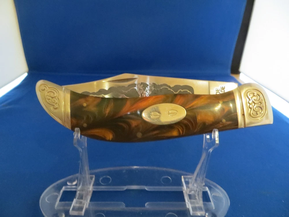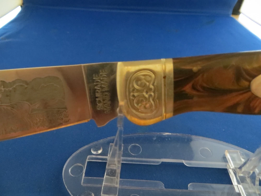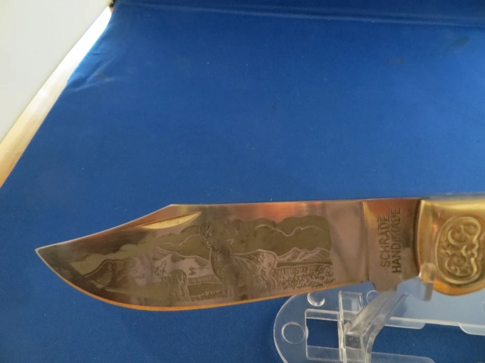 For your consideration is a Schrade SCLD folding pocket knife. It measures 9 1/2 inches overall, 5 1/2 inches closed with a 3 1/2 inch blade. This is the deer model and features a scene of deers etched on the blade. Selling as used only because I no longer have the box. Overall condition is very good to excellent. What you see is what you get. I SHIP VIA UNITED STATES POST OFFICE AND PROVIDE DELIVERY CONFIRMATION NUMBER UPON SHIPPING, IF THIS IS A PROBLEM PLEASE ADVISE. I'm all about customer satisfaction so if there is a problem please contact me first. Insurance is not provided, so If you want your item insured please advise and I'll add it to your invoice. I leave feedback after feedback has been received. Purchases are to be paid for within seven (7) days. Thank you for looking and good luck.