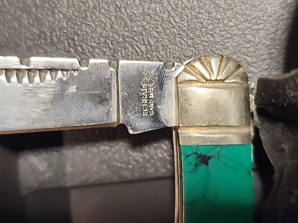 Schrade Classic Custom Whittler Maliquite & Pearl SCWPM Folding Pocket Knife New with paperwork 3 1/2" closed Stainless steel blades, large blade has fancy filework on top, green maliquite & pearl handles with red maliquite spacers, decorative bolsters, and fancy filework on backspring. Never Used, stored in temp and humidity controlled vault. Photos are of actual item please use them as part of my description.
