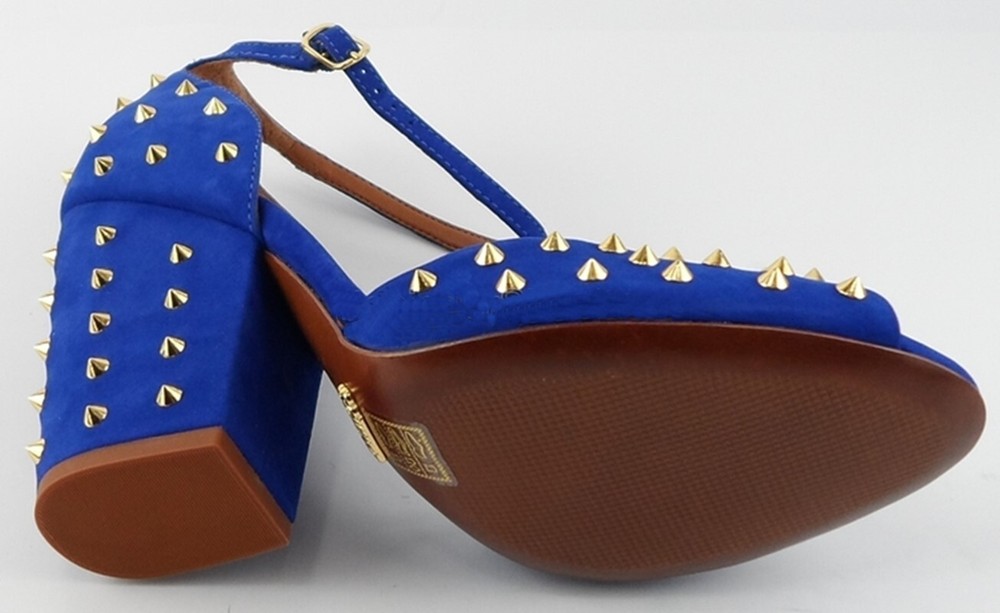 New/ clearance in original box Nubuck/ gold tone spikes upper; Leather lining; Leather sole Covered heel measures 4" * Lightly padded footbed Adjustable ankle strap with side buckle closure Open round toe design Made in BRAZIL *Measurements are hand taken for every item we sell. Every item is carefully inspected to ensure that you receive a quality product. Designer Shoe Box guarantees this product is 100% Authentic