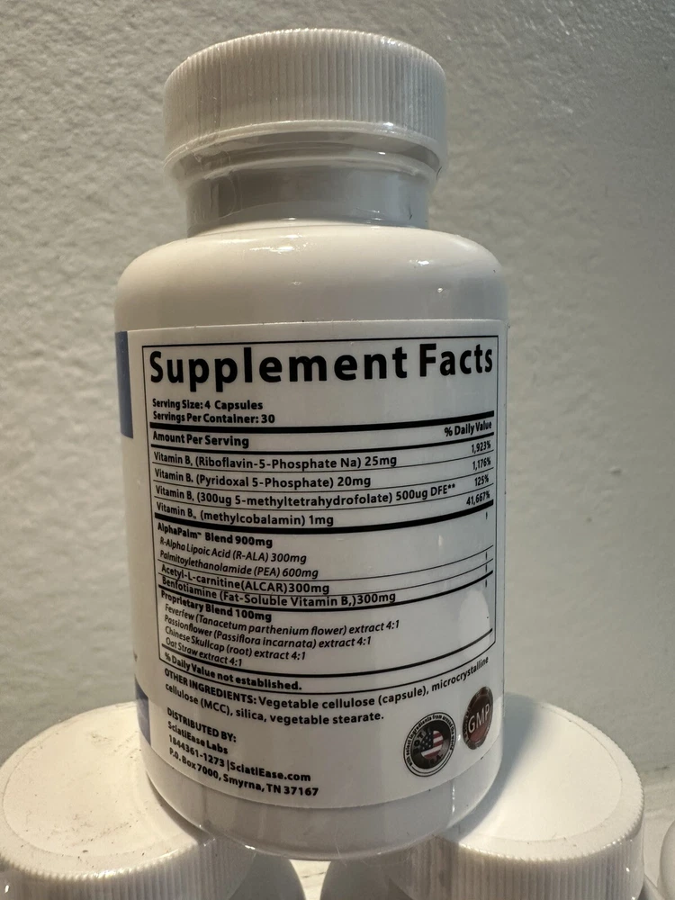 Targets Sciatic Nerve Discomfort: Unlike many sciatic nerve products, SciatiEase is specifically designed to support nerve health and a balanced inflammatory response to help soothe and relieve hip, butt, leg, and lower back discomfort no matter how long you’ve been suffering. Take 2 capsules in the morning and two capsules at night, with meals. We recommend taking our product for 90 days to get the full benefits. Unmatched PEA Formula: SciatiEase comprises a powerful 12-ingredient proprietary formula utilizing some of the most unique compounds for neuropathic discomfort. Our groundbreaking formula now even better with 300mg of r-alpha lipoic acid to further optimize palmitoylethanolamide (PEA), acetyl L-carnitine, and benfotiamine 300mg. Plus, B vitamin complex and premium herbal blend. It’s our best vitamin for sciatic nerve pain to date. Science-Backed Super Herbs for Sciatic Relief: Featuring a synergetic combination of feverfew, passionflower, Chinese skullcap, and oat straw extracts, SciatiEase offers a full-strength sciatic nerve formulation. While each one of our ingredients is powerful enough on its own, together, they create a medley of supernutrients that offer maximum rejuvenation. Fast-Absorbing for Faster Relief: SciatiEase supports your inflammatory response, which can help soothe aches and stiffness, restore mobility, improve flexibility, strengthen muscles, and boost endurance. Our sciatic relief pills only use the most bioavailable form of each ingredient so they can be easily absorbed into your system for faster effectivity and comfort