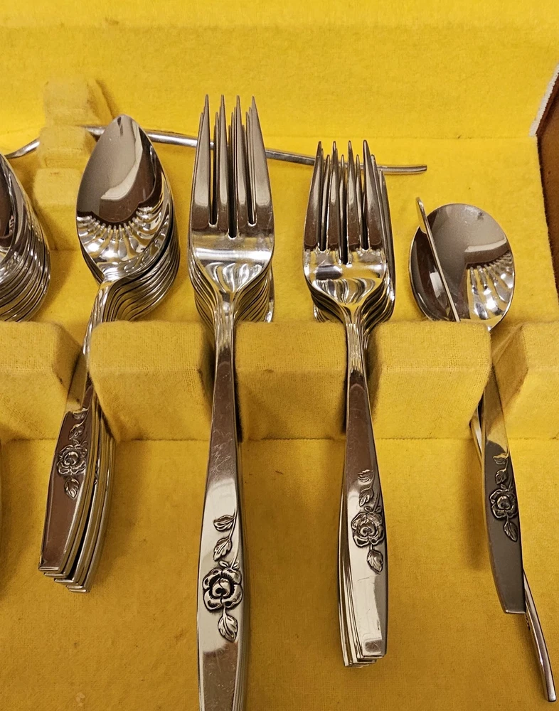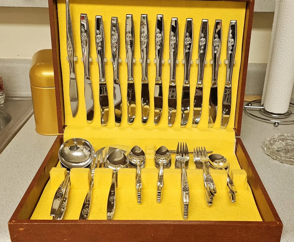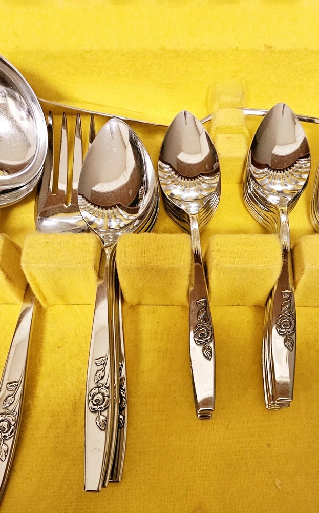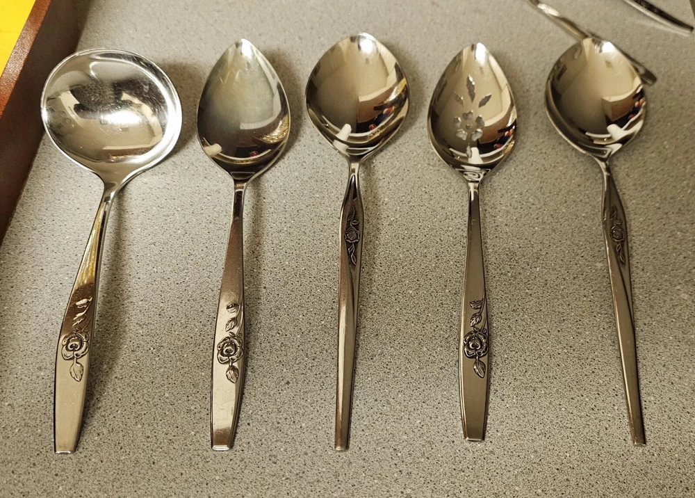 Add a touch of elegance to your dining table with this 64-piece set of Scientific Stainless Steel flatware. The Rose Design by Onieda Ltd is a classic and stylish addition to any Christmas or traditional occasion. Crafted from high-quality stainless steel, this set includes knives, slotted spoons, forks, ladles, serving spoons, spoons, carving forks, and sets, all of which come in a beautiful floral-patterned handle. The set is perfect for anyone who appreciates the finer things in life and is sure to impress your guests. With its sleek and modern design, this flatware set is a must-have for any home. So why wait? Add this stunning set to your collection today and enjoy the sophisticated look it brings to your table.