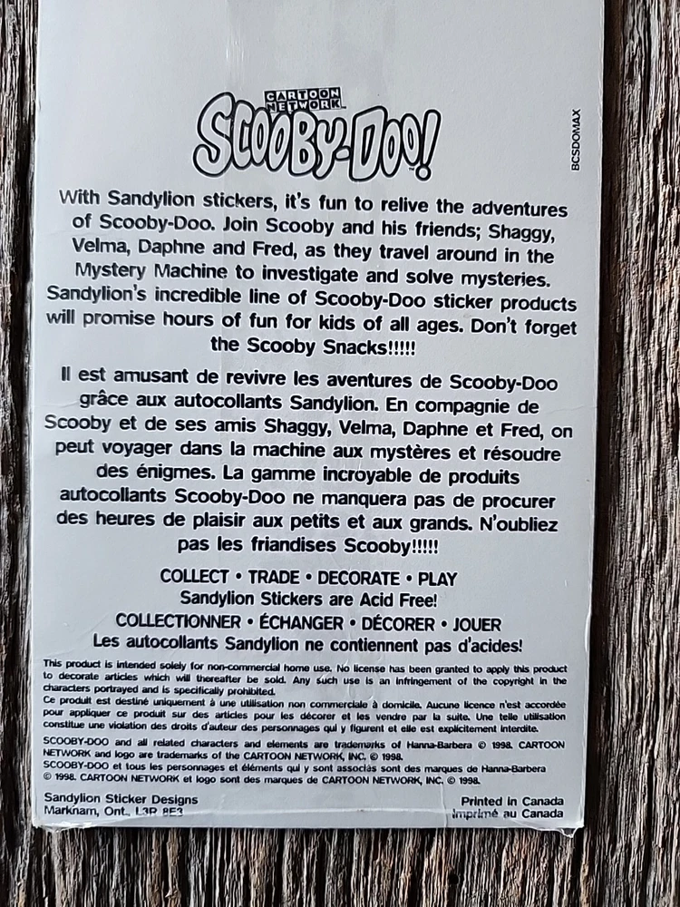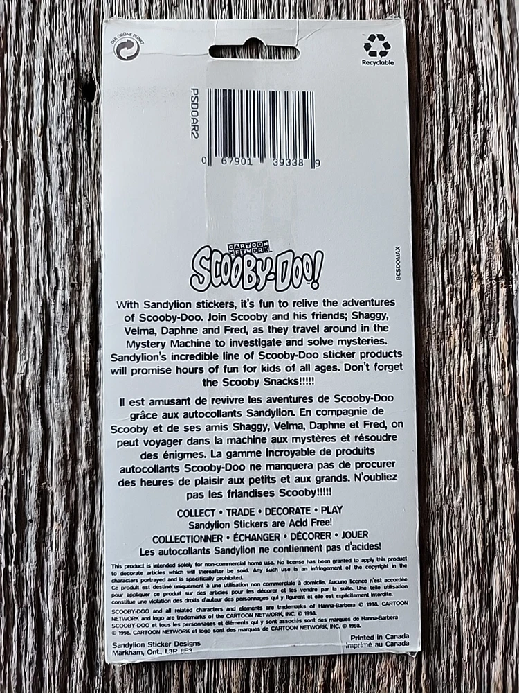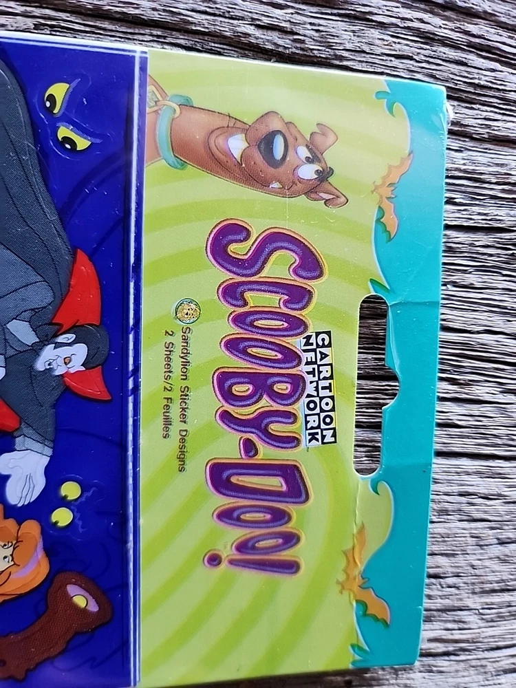 This product is a set of vintage Scooby-Doo stickers manufactured in 1998 by Sandylion. The stickers feature cartoon characters from the popular TV show "Scooby-Doo" and come in two sheets. The stickers are multicolored and made of paper. They are officially licensed merchandise from the Scooby-Doo franchise and were manufactured in Canada. This nostalgic item would be a great addition to any collection of animation memorabilia or Scooby-Doo merchandise. New in unopened original packaging excellent condition