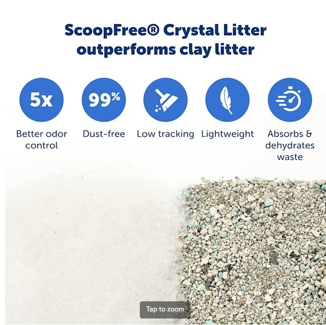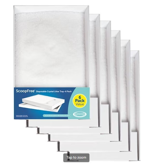 ScoopFree by PetSafe Sensitive Disposable Crystal Cat Litter Tray, Pack of 6 Keep your home clean and your cat happy with the PetSafe ScoopFree Sensitive Crystal Cat Litter Tray, designed for use with the PetSafe ScoopFree Self-Cleaning Cat Litter Box. These completely disposable trays eliminate the need to see, touch, or smell messy waste. Simply replace the tray every few weeks, and your litter box will feel like new. Each tray comes pre-filled with Sensitive Crystals cat litter, free from perfumes and dyes, offering superior odor control compared to traditional clay or clumping litters. The low-tracking, odor-reducing crystal litter helps maintain a fresh-smelling, litter-free home. Key Features Superior Odor Control: Crystals absorb moisture and dehydrate solid waste to neutralize odors. Covered trap locks away solid waste for a cleaner, hands-free experience No Perfumes or Dyes: Ideal for cats and people with sensitivities, completely fragrance- and dye-free Less Mess: Low-tracking crystals reduce litter on floors and paws; 99% dust-free formula Leak Protection: Plastic tray lining adds an extra barrier to prevent leaks Easy Disposal: No scooping required—simply remove the disposable tray and discard How It Works The crystals absorb urine and odors while dehydrating solid waste to keep the litter box fresh. Tips for Longer Tray Life Avoid high-humidity areas: Place the litter box away from bathrooms, basements, or other humid locations, as excess moisture shortens tray life. A room with moving air (like a fan) helps maintain performance. Even distribution: If your cat favors one spot, gently stir the crystals occasionally to distribute saturated crystals. Diet considerations: Cats on high-fiber or high-ash diets may produce more solid waste, filling the tray faster. Switching to a diet without byproducts or fillers can help extend tray life.