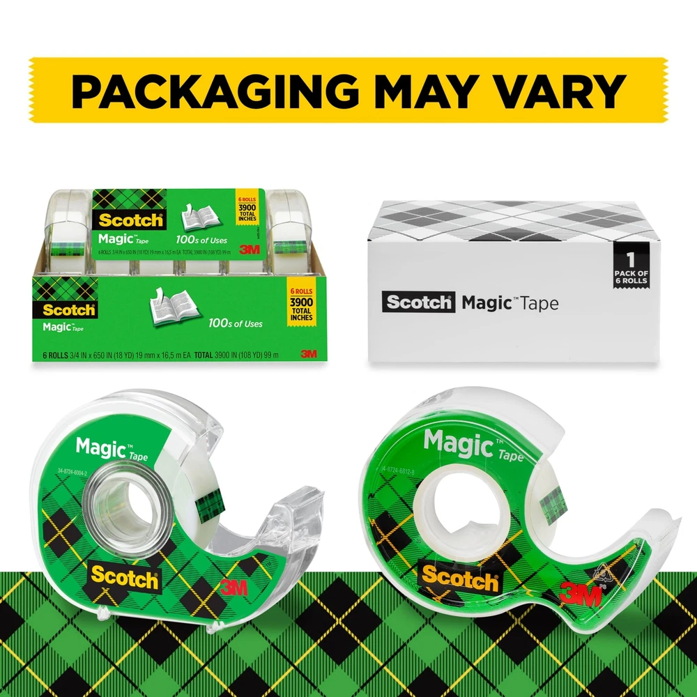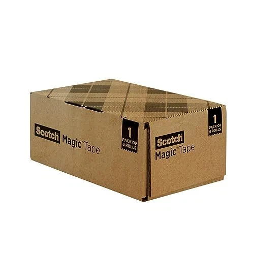 Scotch Magic Tape lets you magically mend the many rips and tears of life - securely, permanently and invisibly. The original matte-finish invisible tape uses unique 3M adhesive technology to bond tightly with paper and disappear without a trace. It's the ideal matte tape for permanent, secure paper mending, whether you need to make a quick fix or an addition to your project. This clear tape is also perfect for fixing torn or ripped originals, like birth certificates or library book pages. Easy to apply, this office tape is photo-safe for worry-free mounting or mending of special photos. You can even write on this adhesive tape with a pen, pencil or marker, making it easy to label items. With the easy-to-use Scotch tape dispenser (included), Scotch Magic Tape rolls out smoothly and cuts easily with no time, energy or tape wasted. These dispensers are a convenient addition to school, classroom supplies or office supplies. Make an eco-conscious choice: refill and reuse the included hand-held office tape dispenser with Scotch Brand Tape. The best projects start with Scotch home and office tape. INVISIBLE TAPE: 6 rolls of Scotch Magic Tape with dispenser mends rips and tears securely, permanently and invisibly BONDS SECURELY: Clear tape that gives you a strong, secure and permanent seal using trusted 3M adhesive technology BLENDS IN: Matte finish and invisible, this tape blends in with paper, making it a great addition to your back to school supplies IDEAL FOR: Use this office tape for permanent, secure paper mending, including mounting, quick fixes, project additions and repairing original documents and photos REFILLABLE TAPE DISPENSERS INCLUDED: Tape glides off easy-to-use Scotch tape dispensers (included) smoothly and cuts easily ADDITIONAL BENEFITS: This photo-safe tape is easy to apply; Plus, you can write on it with a pen, pencil or marker for easy labeling PACKAGE CONTENTS: One package with six dispensers containing six tape rolls that are 0.75 in. x 650 in., with a 1-in. core SCOTCH BRAND: The best projects start with Scotch home and office tape